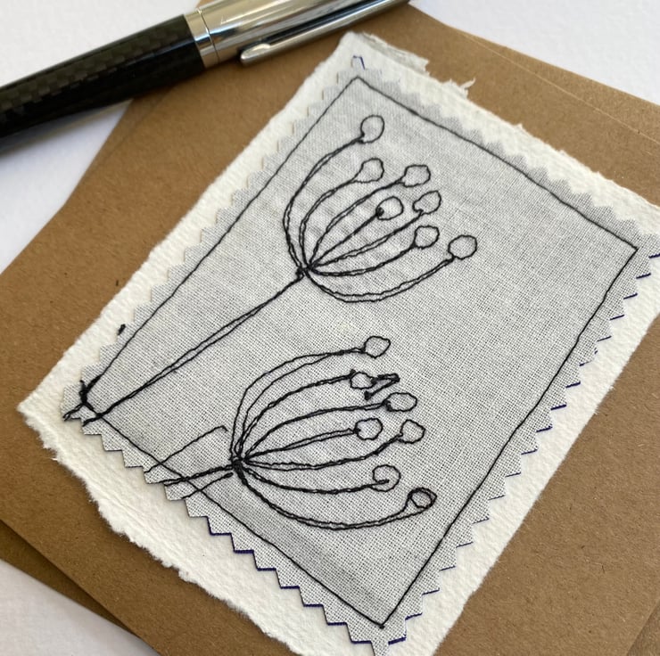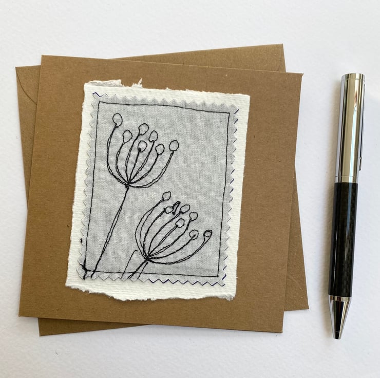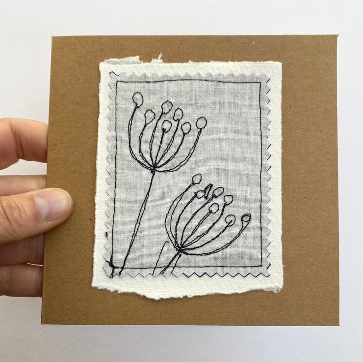 This delicate embroidered line drawing of a stylised dried flower garden card has been made with up-cycled fabrics and enhanced with free motion embroidery. It’s perfect for special people and occasions. It is blank inside. This brown card measures 13.5 x 13.5cm, comes with an envelop and in a plastic cover for protection.