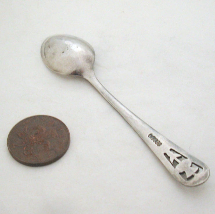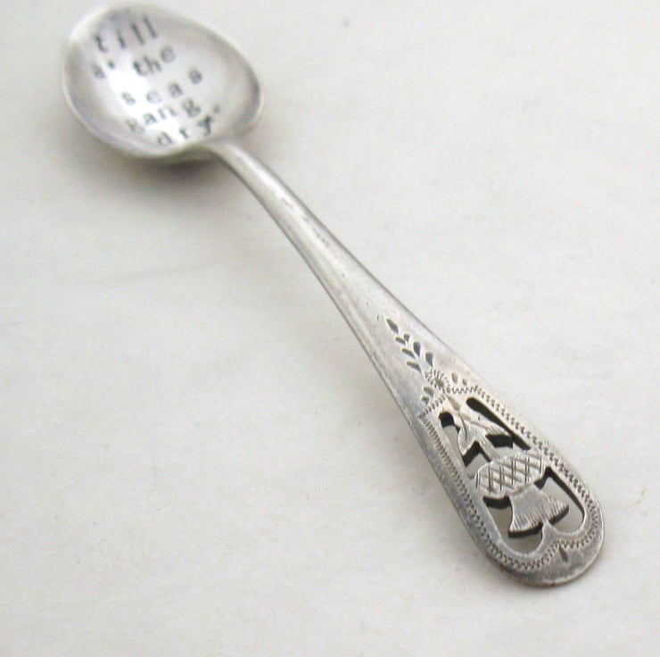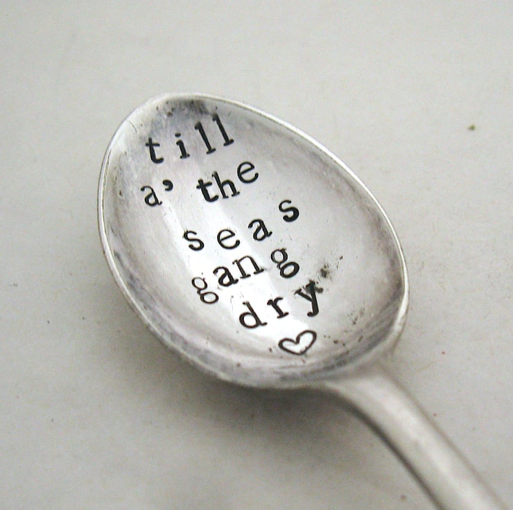A bit of a Scottish theme going on with this one, it's a vintage silverplate (EPNS) coffeespoon with an original cutout thistle design on the handle and a hand stamped quotation from Robert Burns added by me in the bowl, along with a little heart. Bonus Scots points if you can name the song from which this line comes. We're a wee bit early for both Burns Night and Valentine's Day but it would make a great gift on either of those dates, or a delightful small wedding or anniversary present on any day at all. And it's a bargain as well so what's not to love?