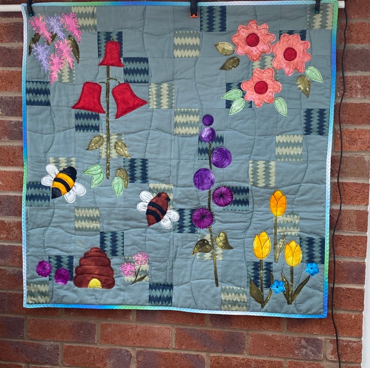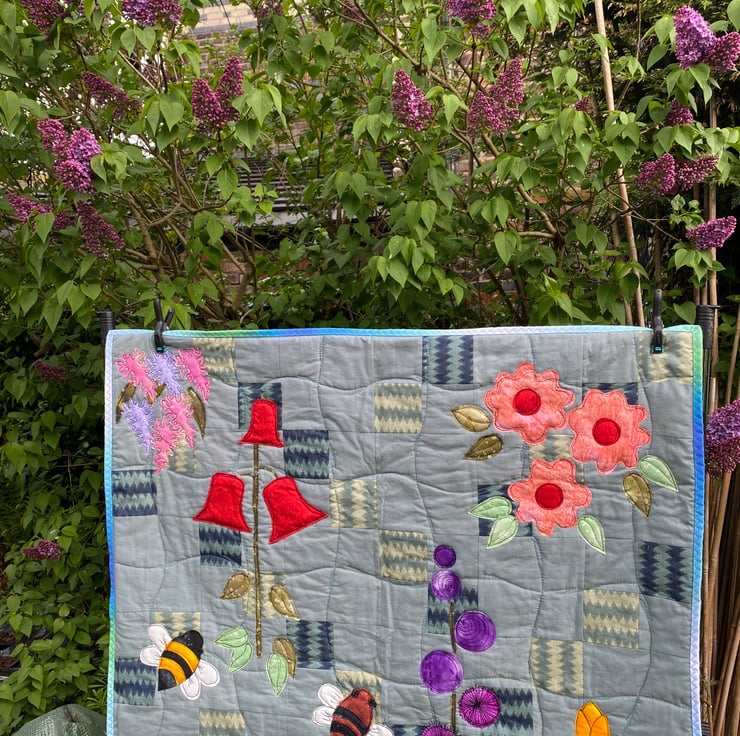 As a wall-hanging or a lap quilt it would bring the garden indoors in a conservatory, garden room, summer house or florist shop, where it would set the scene, so to speak.