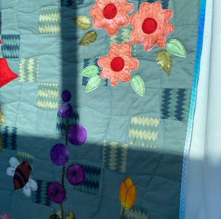 The basic quilt being green made me think of a garden with lots of flowers in the summer and I thought I’d use raw-edged appliqué to add them to it..