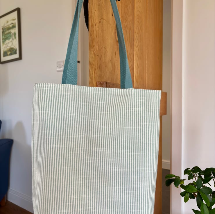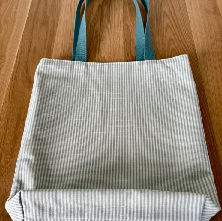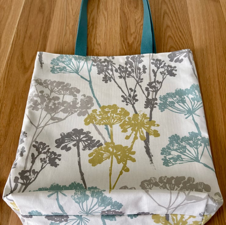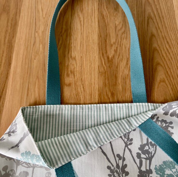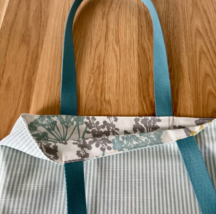 Handmade reversible tote bag in 100% cotton fabric. One side is a floral print of stylised cow parsley stems in aqua blue, grey and mustard on an ivory background. The other side is pale green and ivory stripes. Strong cotton webbing handles in aqua.