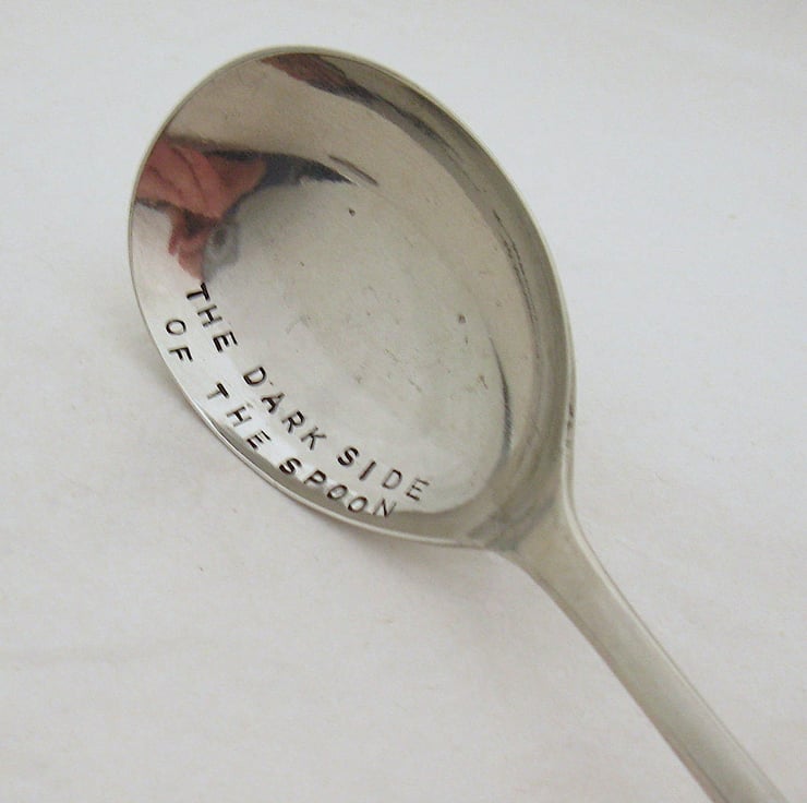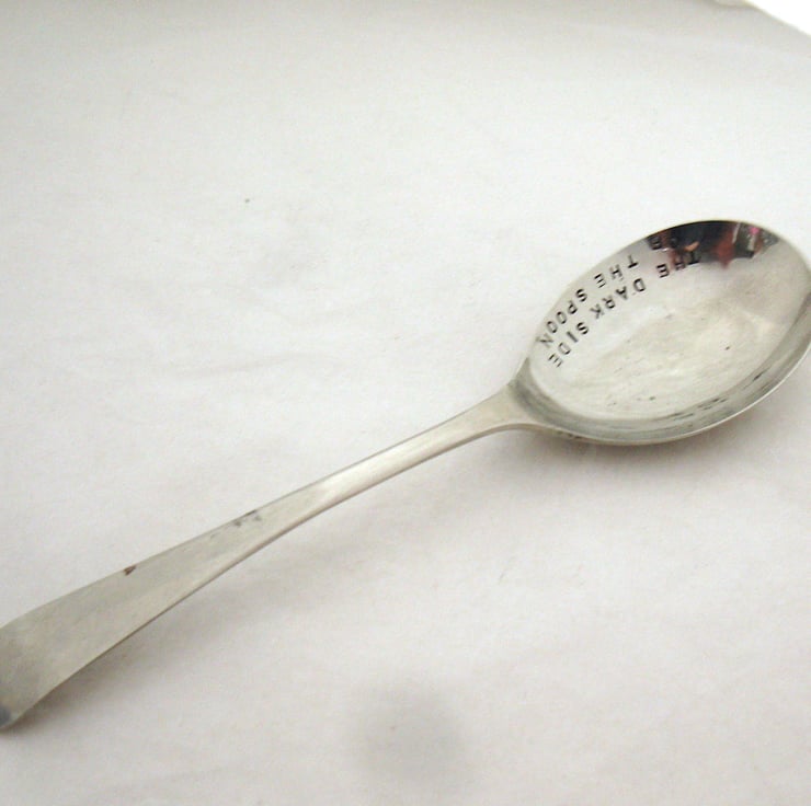 A hand stamped vintage nickel silver alloy fruit spoon with the words 'THE DARK SIDE OF THE SPOON' inside one edge of the bowl. It's a plain 'old english' style spoon measuring approximately 14cm long. Great for ice cream, puddings, or as a small soup or cereal spoon.