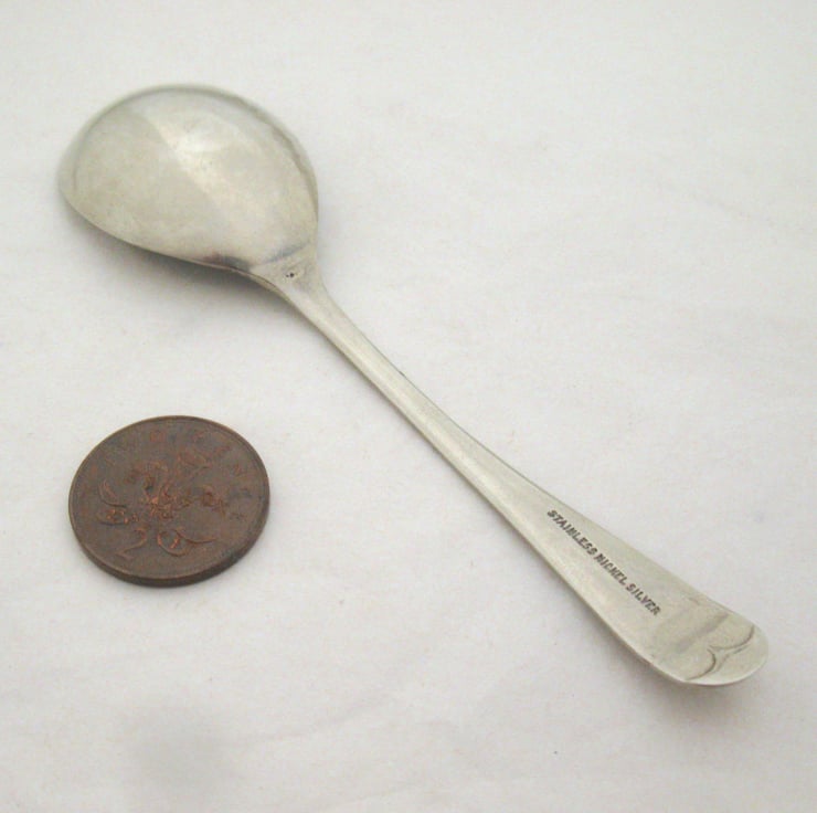 Please note this is a vintage spoon (I think it's 1940s to 1950s) so it does have scratches and wear marks although these in no way affect its functionality as a spoon and it is honestly shinier than my photos make it look. And as it's alloy rather than silver-plated, it's always going to have that wartime look, there's a slightly brassy tint to it no matter how much you polish it. I have reduced the price to a fiver and put it in the bargain bin anyway.