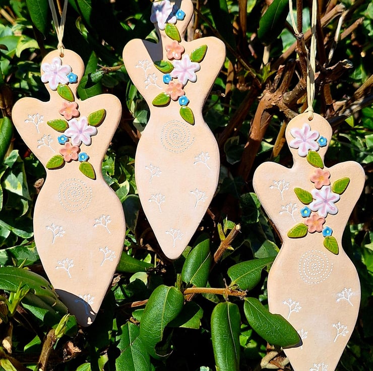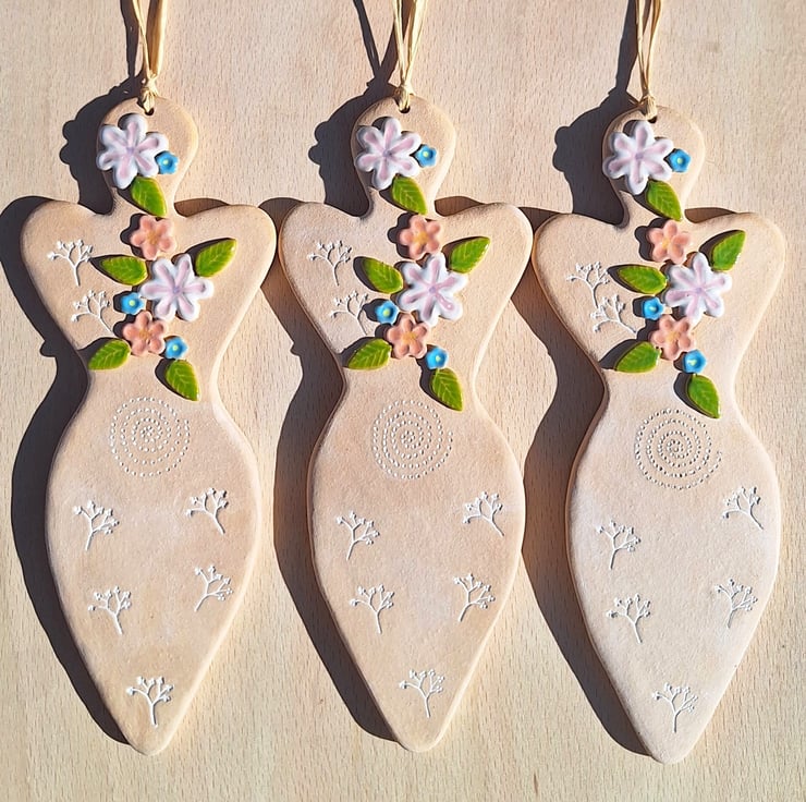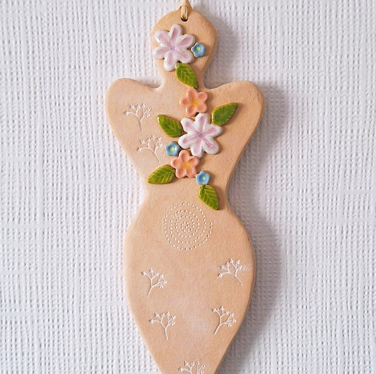 A hand-made and glazed earthenware hanging 'Blodeuwedd' Goddess decoration, featuring a floral and embossed decoration.
