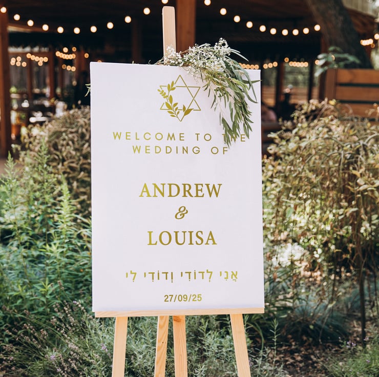 Whether displayed on a mirror, welcome board, or acrylic sign, this elegant design brings a spiritual and stylish touch to any Jewish wedding.