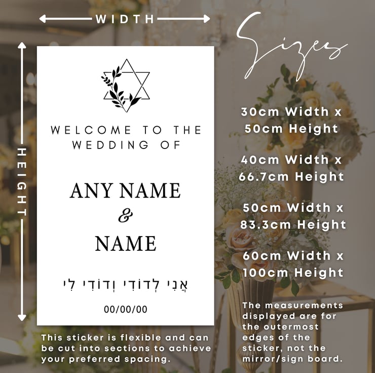 Celebrate your special day with beauty, meaning, and heritage. Our “Welcome to the Wedding of…” vinyl sticker features a modern Star of David design accented with foliage, a personalised name and date section, and the timeless Hebrew verse: I am my beloved’s and my beloved is mine.