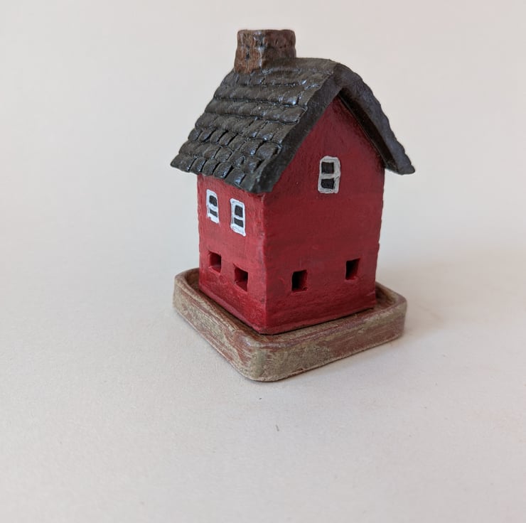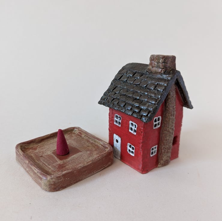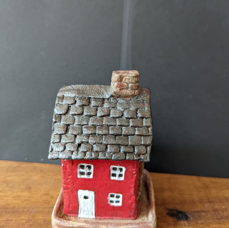 Cottage incense burner. All items are made from scratch. I draw and plan each building then cut the pieces out of clay. I add textures and details then build them. Once they are assembled I decorate them with coloured clays and oxides before the bisque firing then they are glazed and fired once more. Every little building is unique.