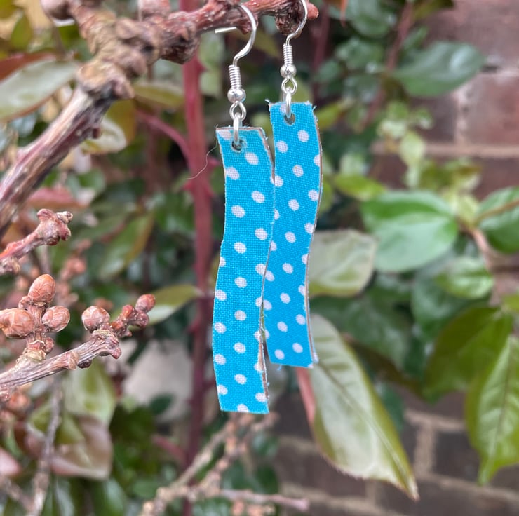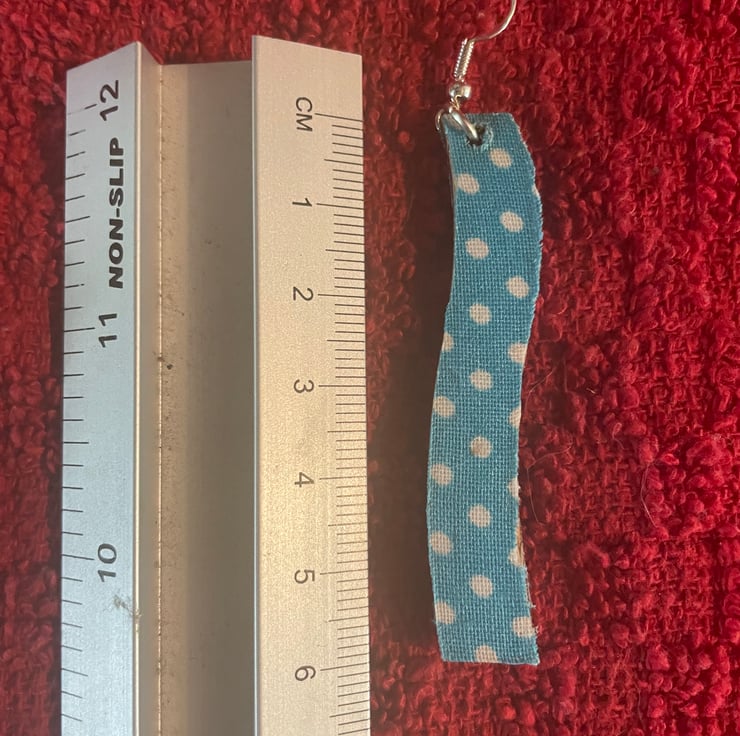 Lovely earrings made with recycled fabric decoupaged onto precut wooden shape. Happy to take commissions for alternative shapes and fabrics so you can have the perfect earrings to match your vibe! Approx 5cm length
