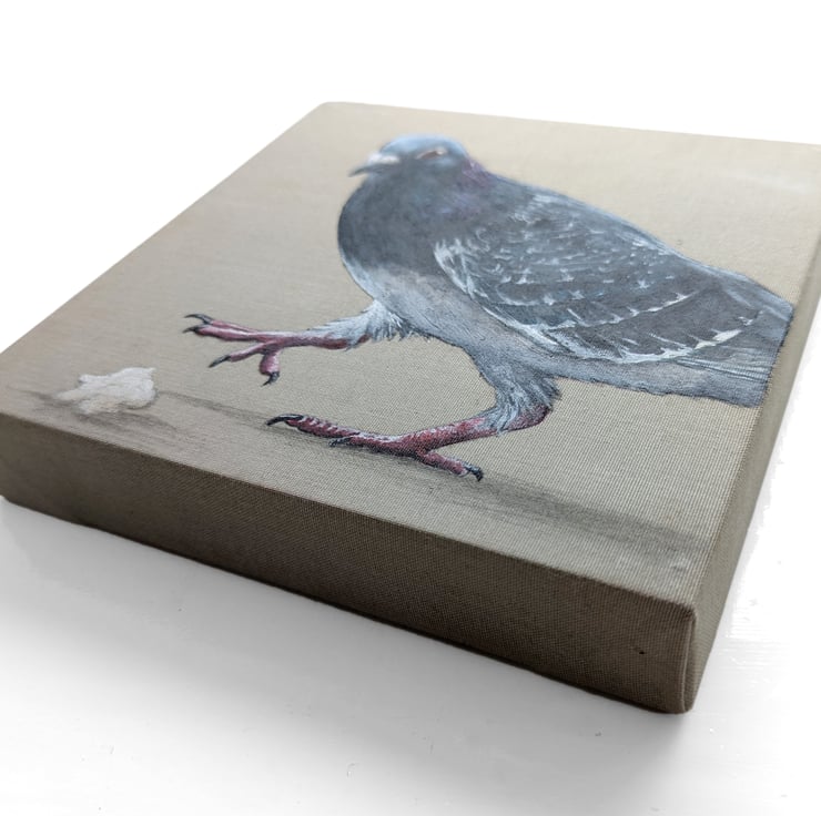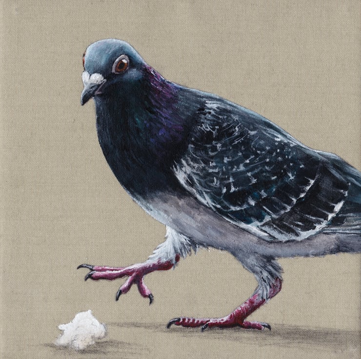 In my artwork, I aim to restore a sense of individuality and dignity to these birds. Working from my own photographs, I paint each pigeon on its own canvas, capturing its unique colours and personality.
