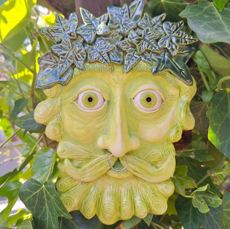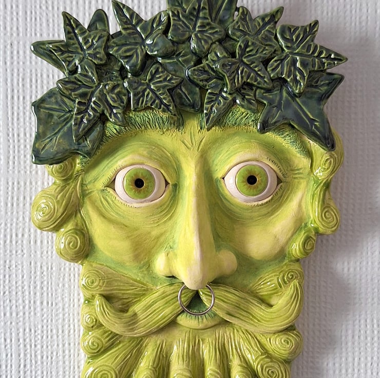Bill is lovingly glazed with a matt finish face, with glossy hair and a beard and a green glossy ivy crown. He also has a cheeky nose ring! A wire hanger is on the back for hanging.