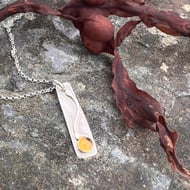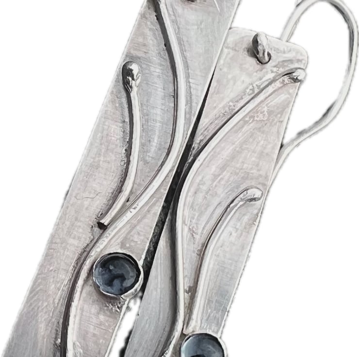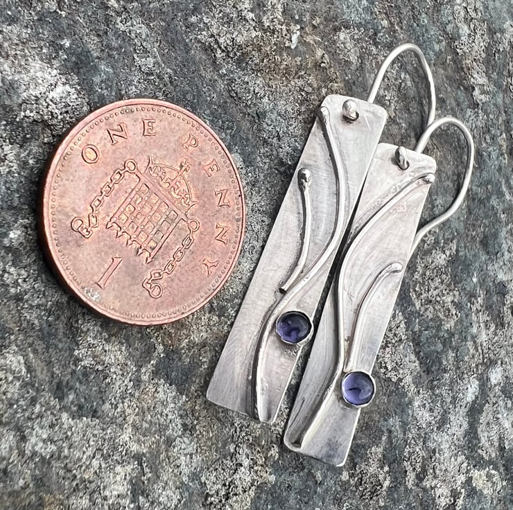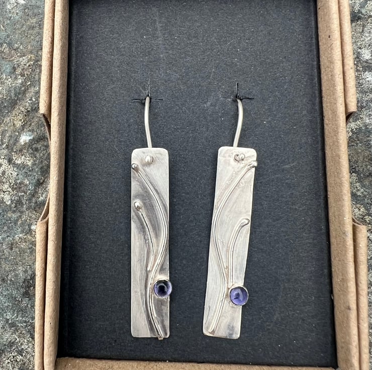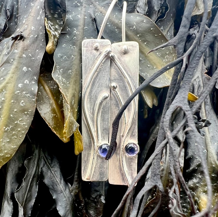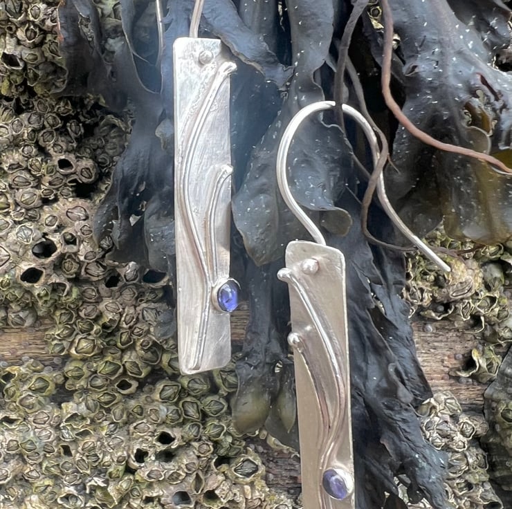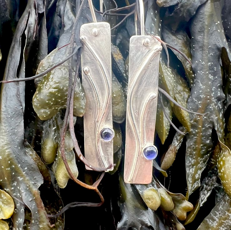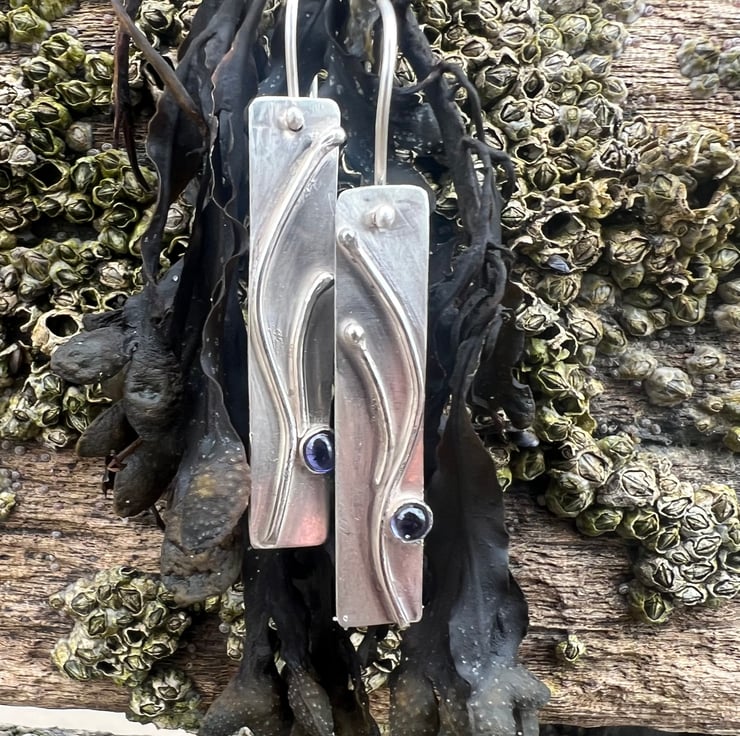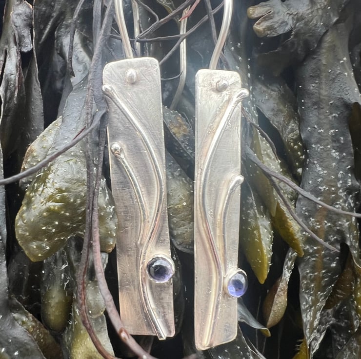 A long silver rectangle decorated with a silver organic design, inspired by the swirls of seaweed. Blue/ purple Iolite gemstones, set in silver, sit on the bottom edge like a splash of seawater.