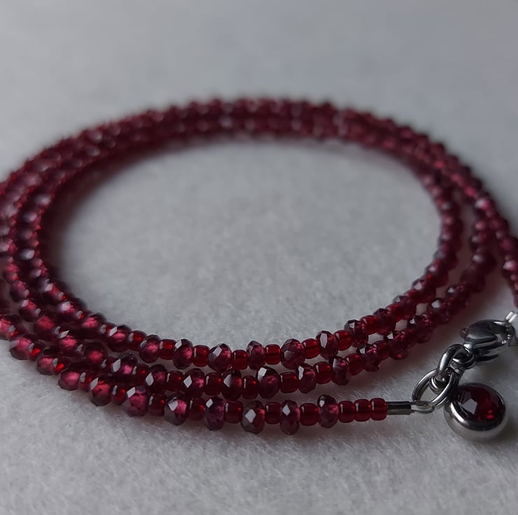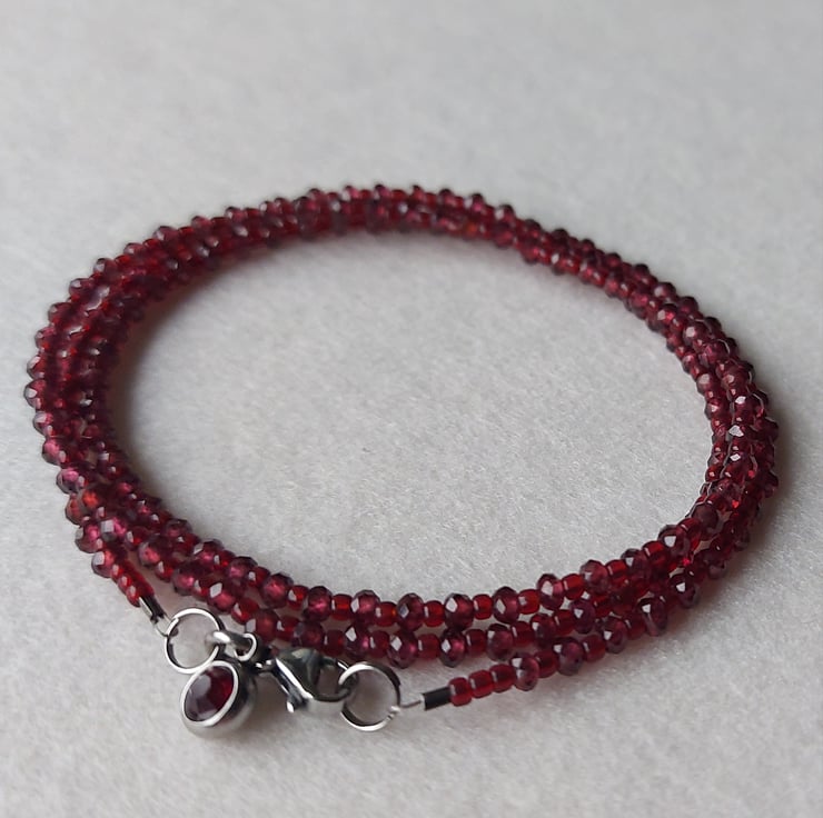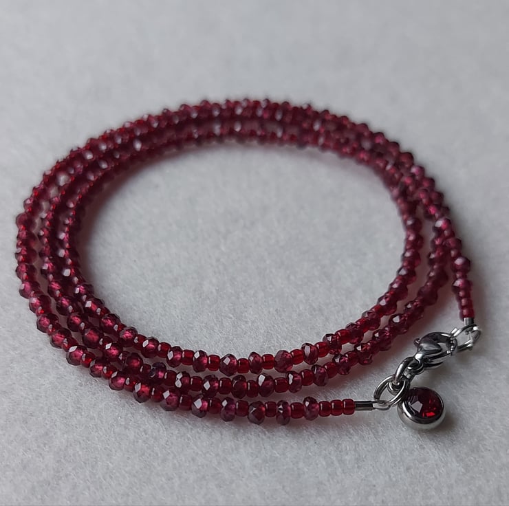 A triple-wrap bracelet made with 3 x 2mm faceted Garnets and top quality seed beads. The findings are stainless steel. The bracelet is finished with a stainless steel and crystal charm to match the garnets. This bracelet will fit up to a 7.5" wrist. It can also be worn as a necklace.