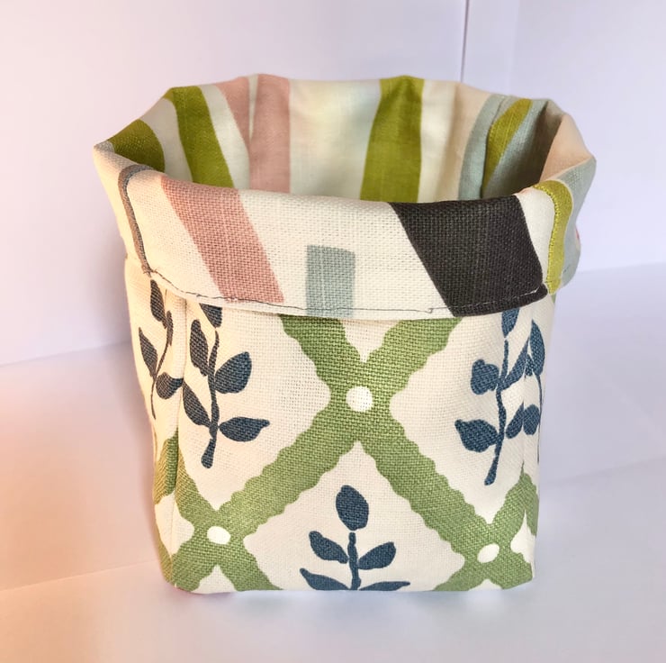 Reversible fabric storage basket.