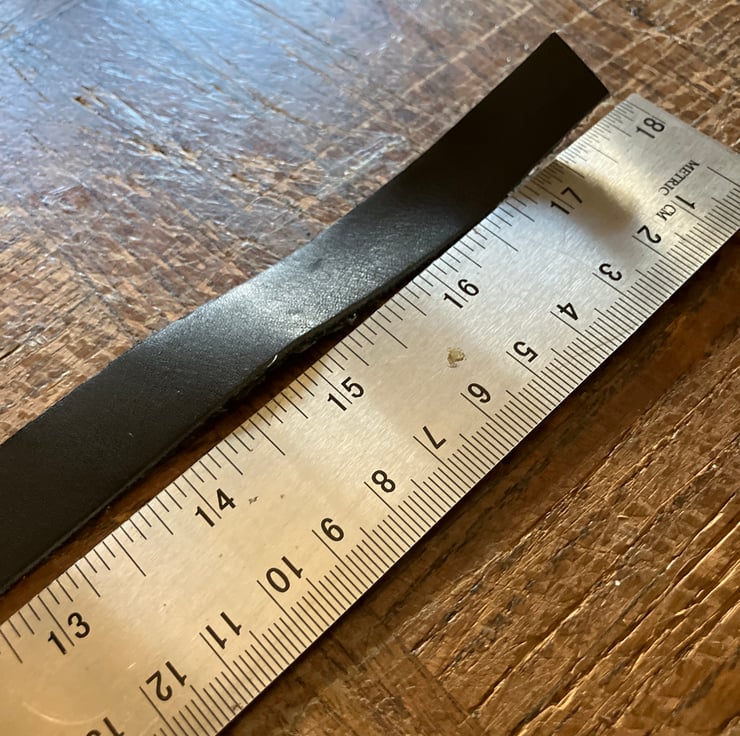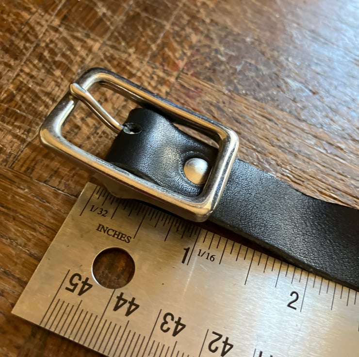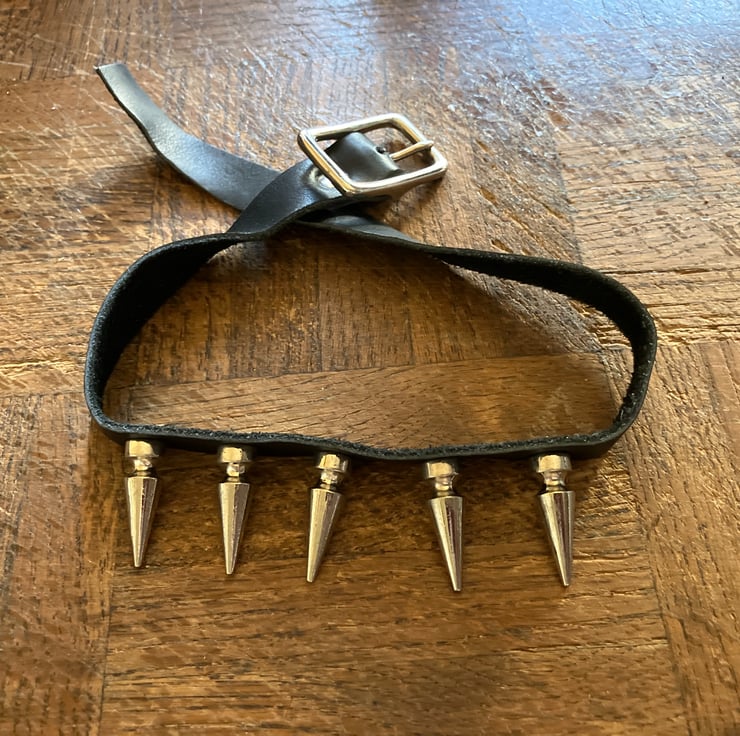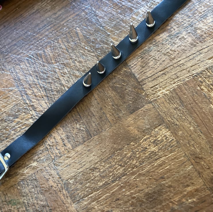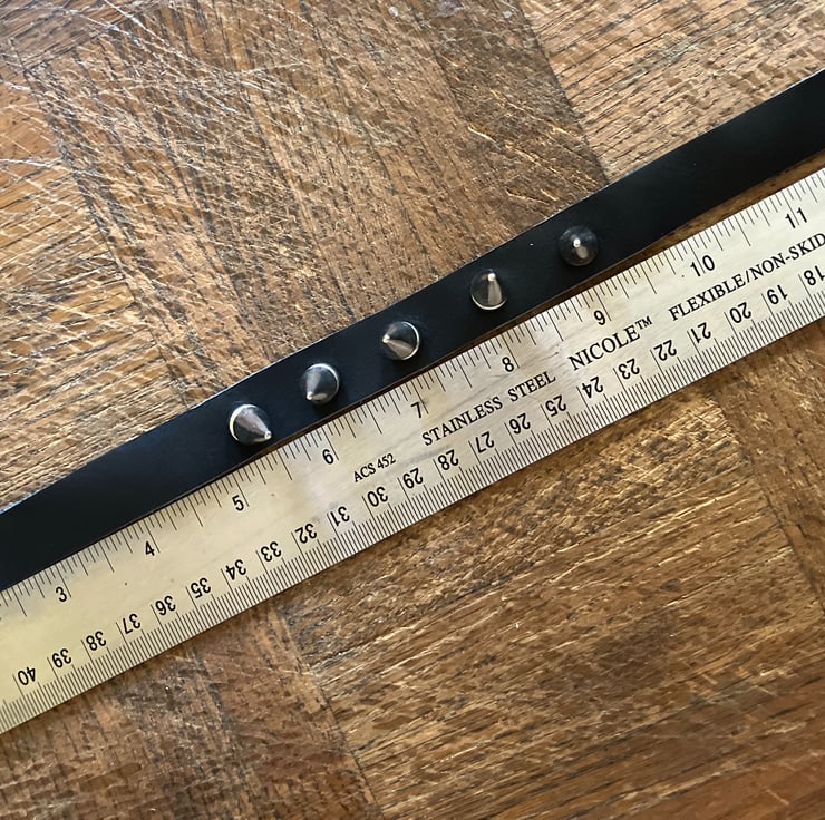 3/4" width -- soft black leather choker with 5 spikes riveted onto the choker. (Last photo shows the backside of the choker so you can be assured the spikes will NOT fall off the choker)