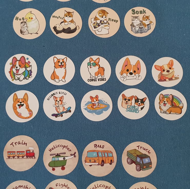buttonsbooth currently have over 100 sticker themes in stock.