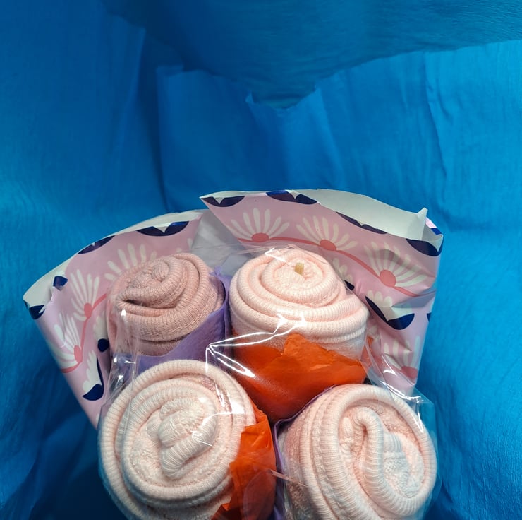 - Baby Sock Bouquet (4 Pack): Four pairs of cozy baby socks presented as a delightful floral arrangement.