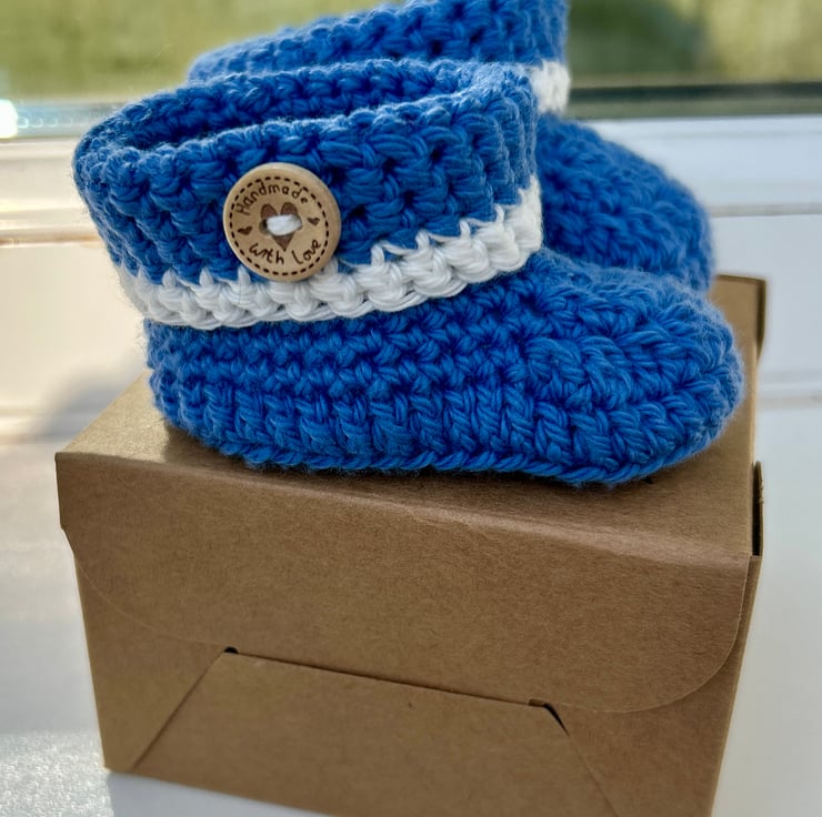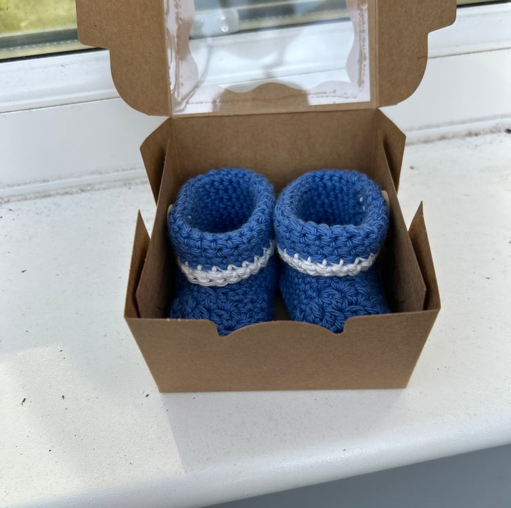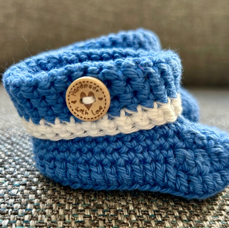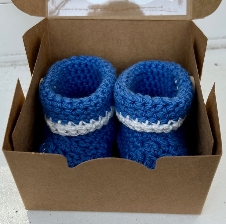 A dear little pair of babies blue booties crocheted in a lovely soft, machine washable 100% cotton yarn.