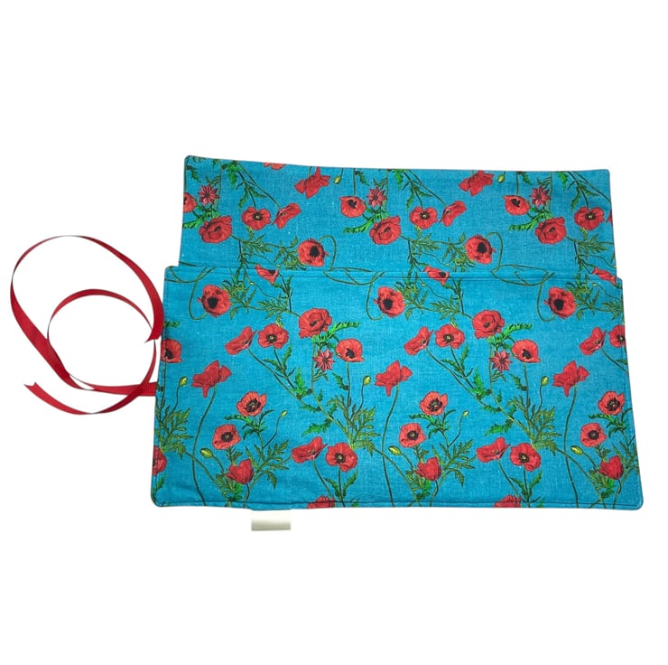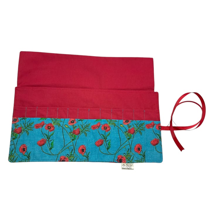 A pretty small red poppies floral patterned fabric is the centrepiece of this crochet hook case. Would also work well for shorter narrow diameter Dpns too. I have carefully paired it with a heavier weight red cotton canvas for the lining, underside of the flap and upper needle pocket.