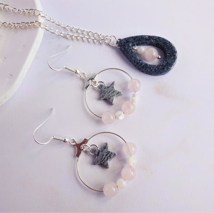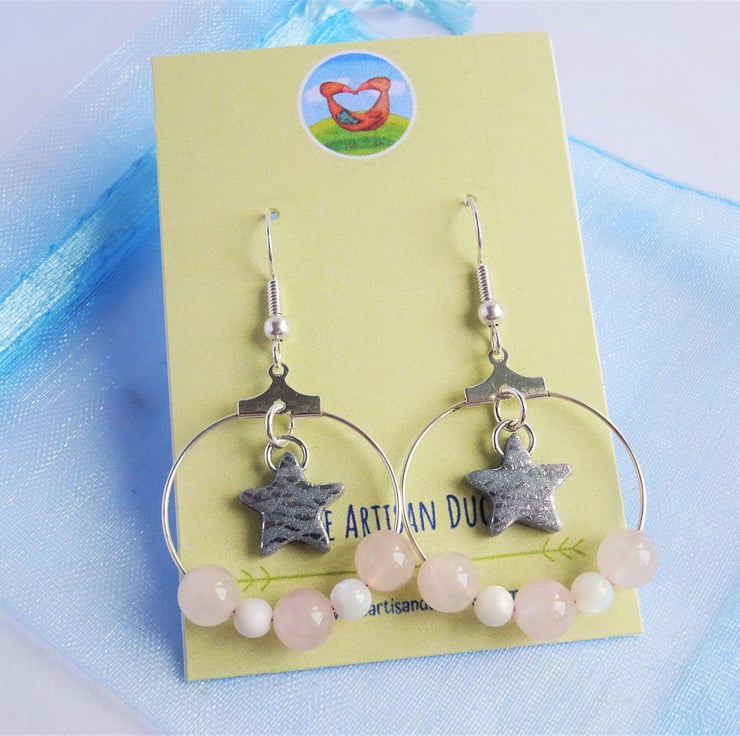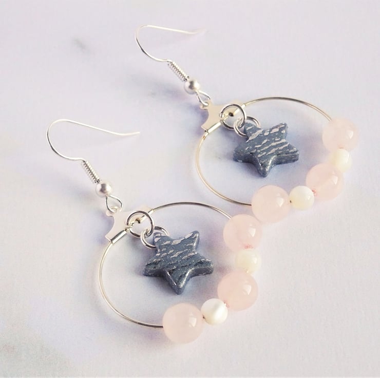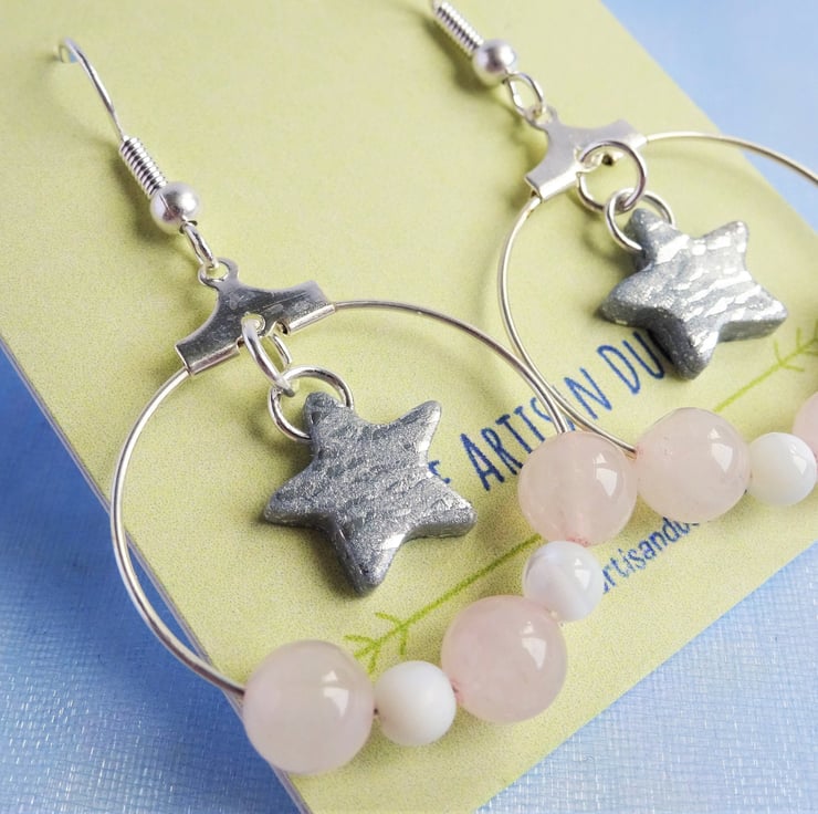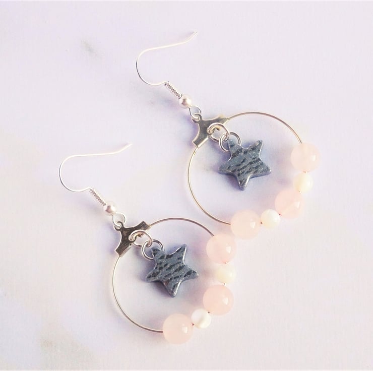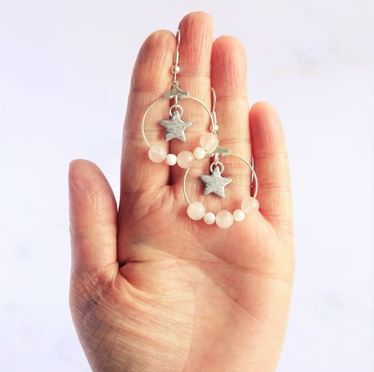 These semi precious earrings feature a silver plated hoop decorated with three soft pink Rose Quartz beads alternating with two smaller milky white Mother of Pearl beads. From the centre of each hoop hangs a handmade, silver polymer clay star, which has flecks of shiny silver foil on it's surface to catch the light as the earrings move.
