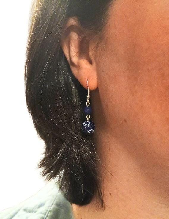 A pair of blue and white beaded drop earrings.