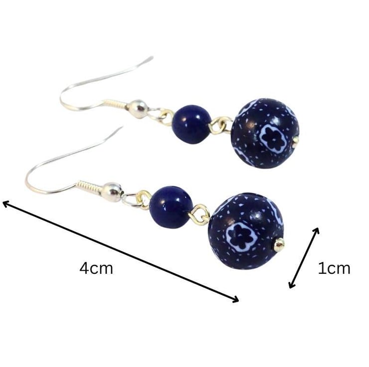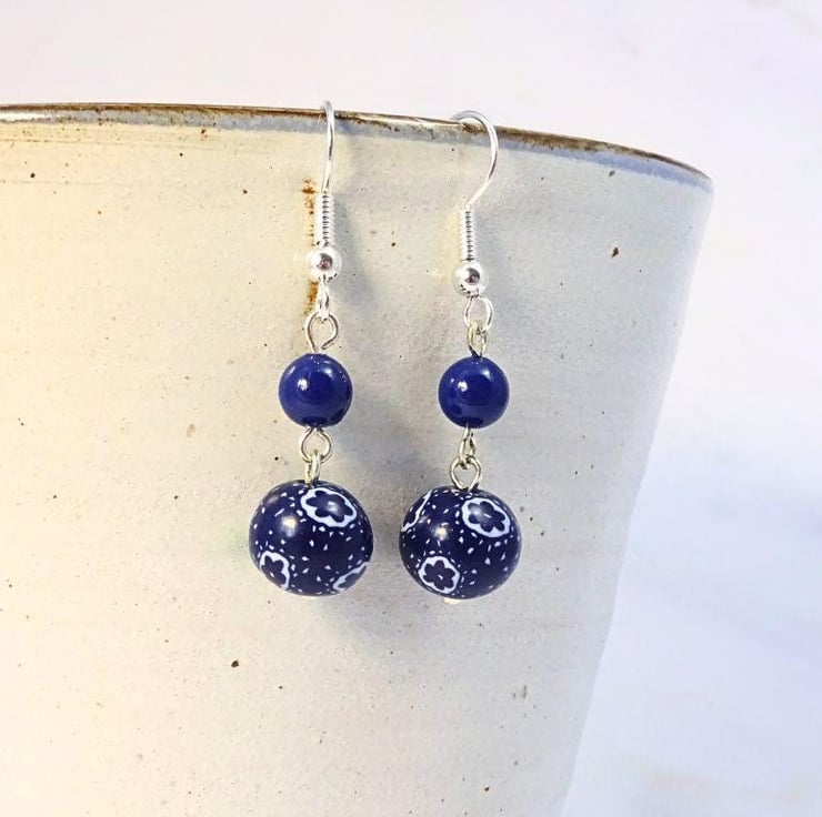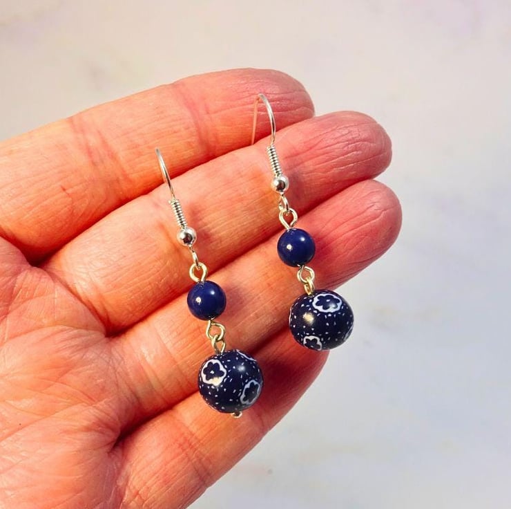 Each earring features a floral and polka dot pattern bead which has been handmade from polymer clay. These flower pattern beads are hung with glass blue pearls from silver plated earring wires.