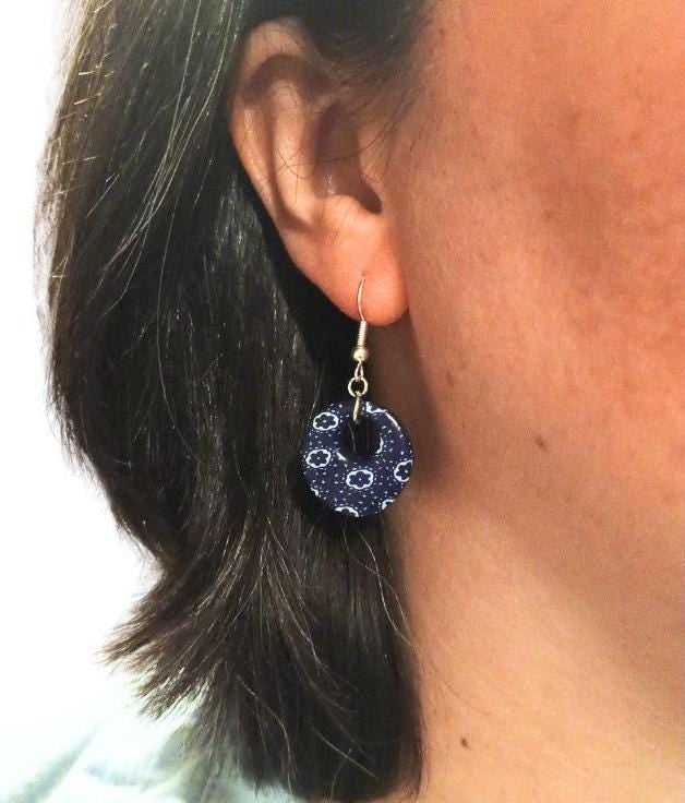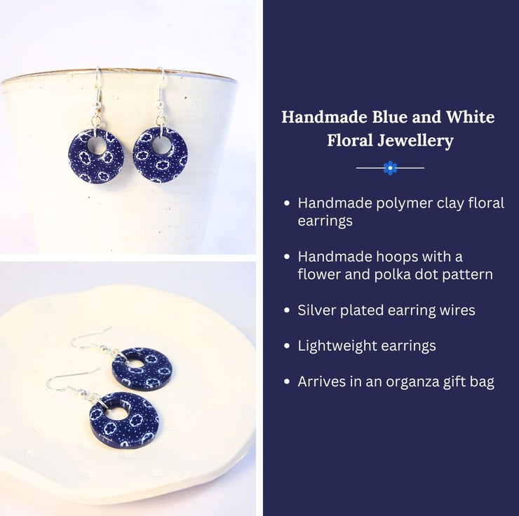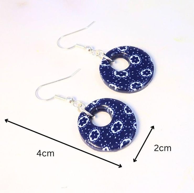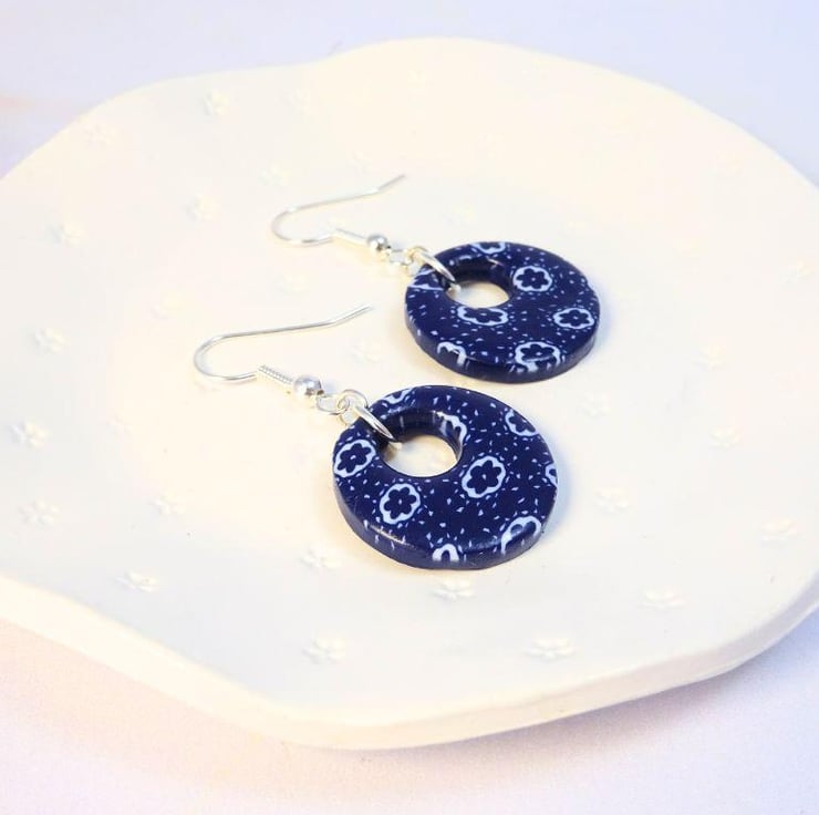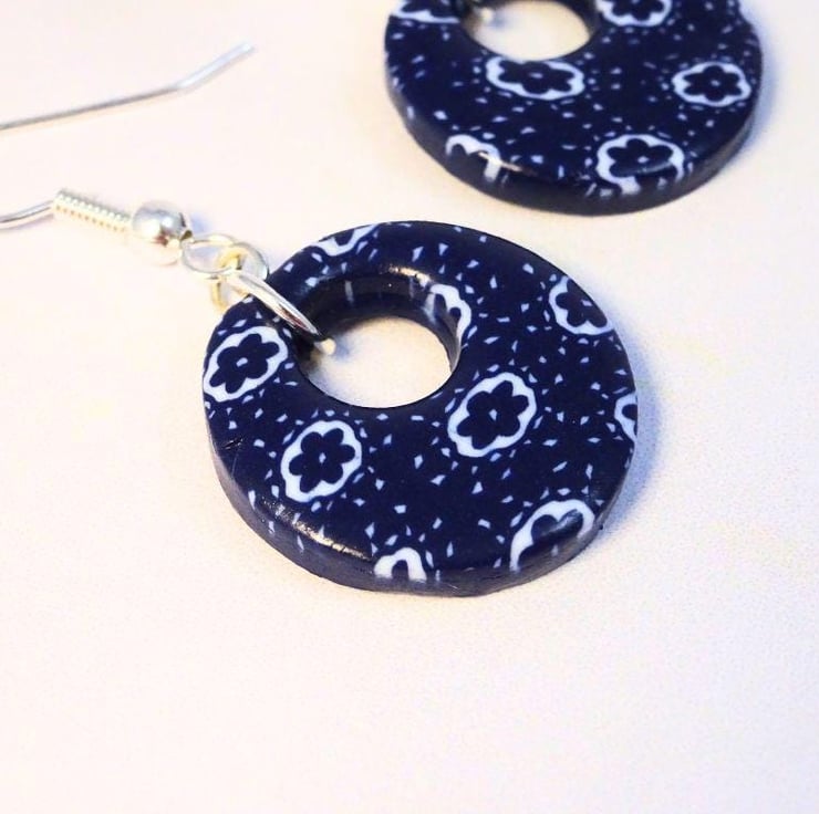 These dark blue hoops have been handmade from polymer clay and feature dark blue flowers in white circles, surrounded by dark blue clay with white polka dots. They have been hung from silver plated earring wires.