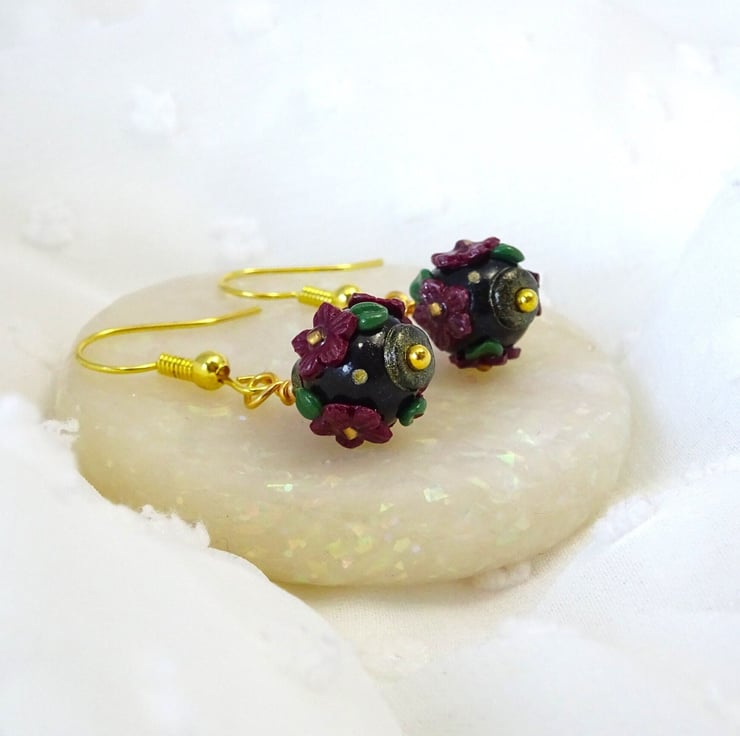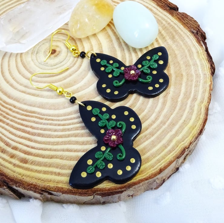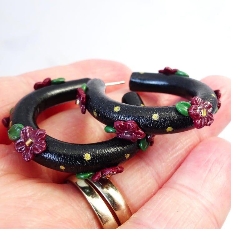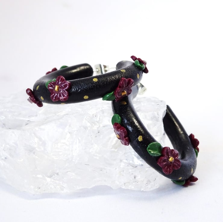 These hoop earrings have been handmade from polymer clay and feature detailed dark red flowers and green leaves set against a black hoop. Further detail is added with gold beads for the centre of the flowers and gold dots along the length of the hoop. The whimsy goth inspired earrings are finished with silver plated earring posts and butterflies.