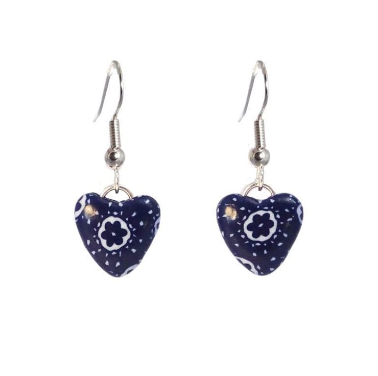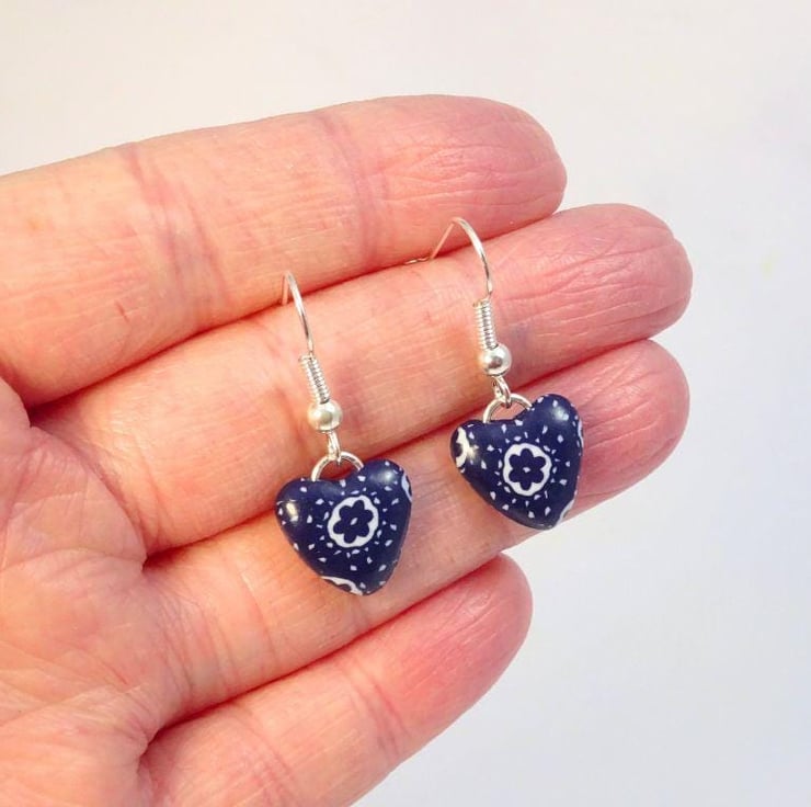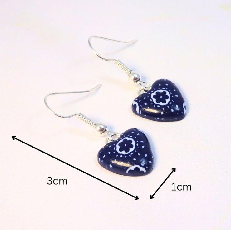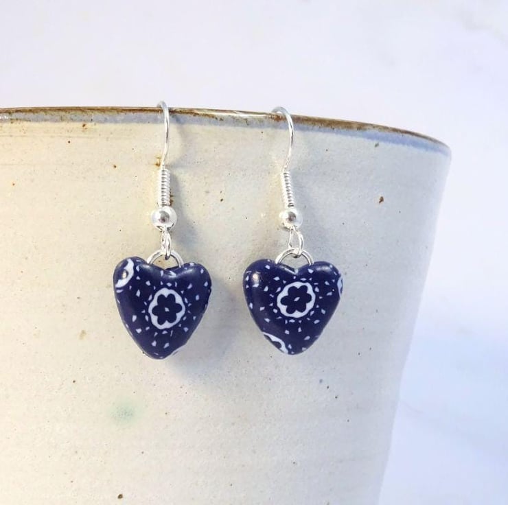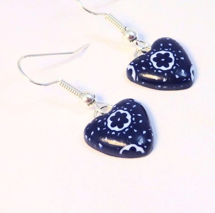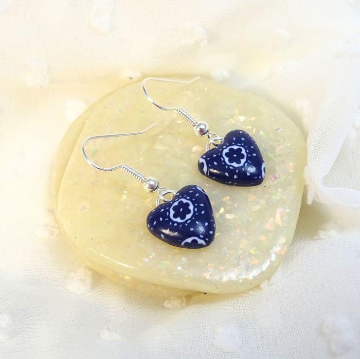 These lightweight heart earrings are handmade from polymer clay using a technique called cane work. They feature a dark blue floral pattern surrounded by white polka dots which has been shaped into hearts.