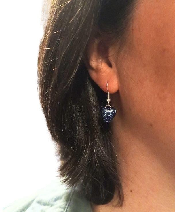 Small Heart Drop Earrings, Dark Blue and White Earrings, Flower and Polka Dot