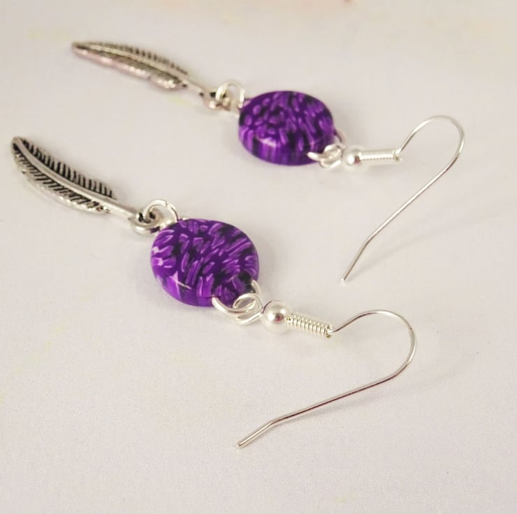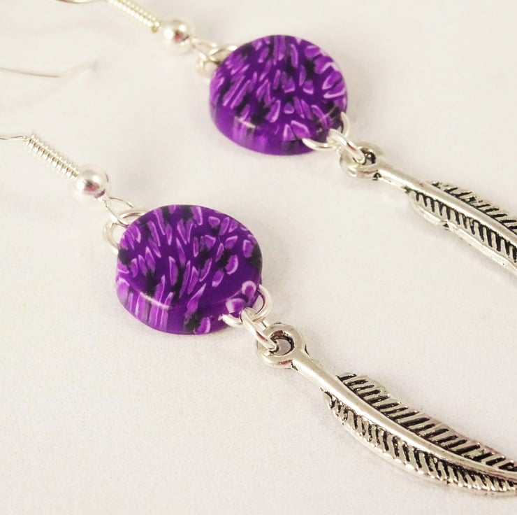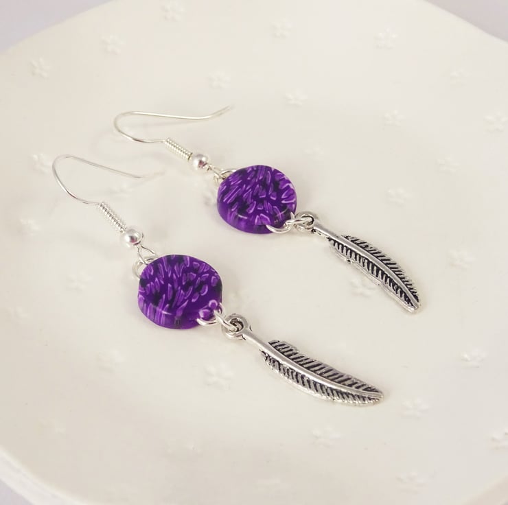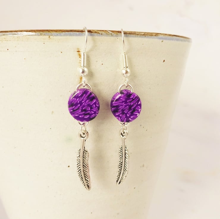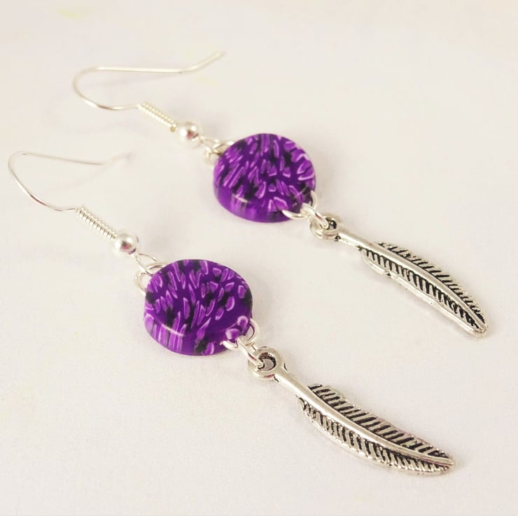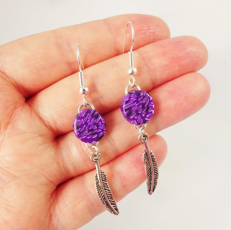 Add a pop of colour and a touch of bohemian flair to your style with these Purple Patterned Feather Charm Drop Earrings. The purple patterned discs are handmade from polymer clay and are finished with silver plated feather charms. These earrings are hanging from silver plated earring wires.