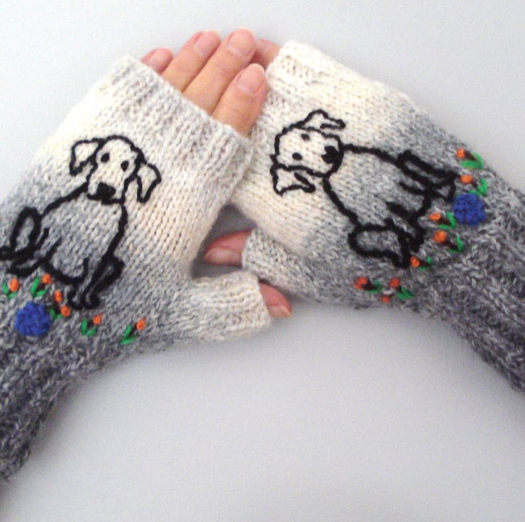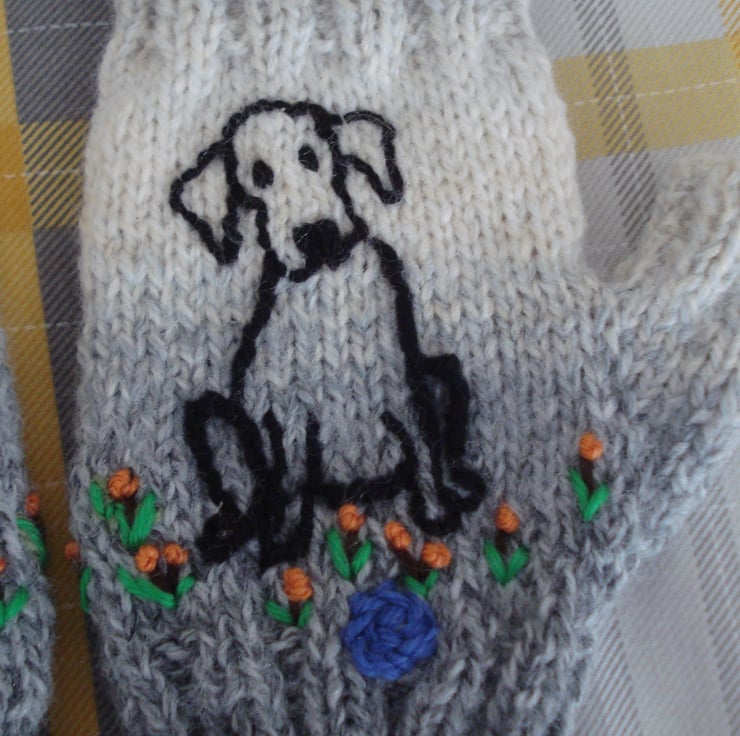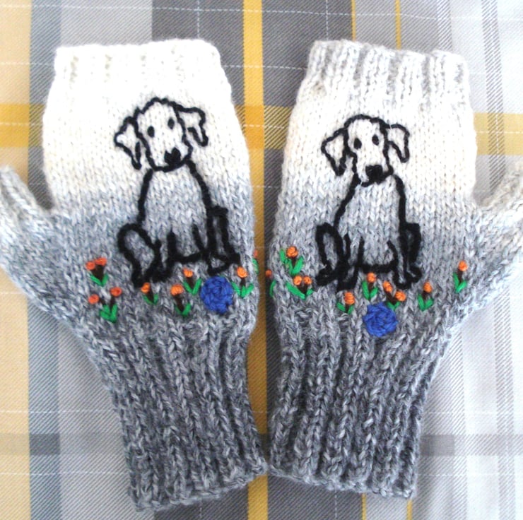 This is a pair of fingerless gloves knitted in a lovely soft yarn which knits from grey through to cream. There is a hand embroidered puppy dog with his blue ball at his feet on each glove and he is sitting amongst flowers. I think he looks like my neighbours Labrador puppy.