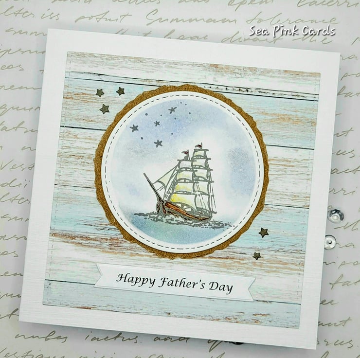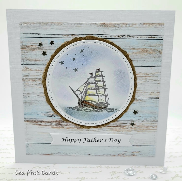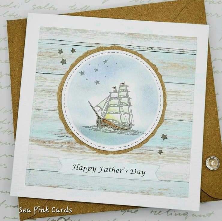 A stylish card for father's day, featuring a sailing ship and a clean and simple design. The card measures 14.5 x 14.5 cms and comes supplied with a 100% recycled brown kraft paper envelope. It has been designed and individually handmade in my craftroom with a coastal inspired colour palette. I used grey archival ink to stamp the ship and coloured it with watercolours, then created the background with ink and brushes. The card has a layer of wooden plank design paper and torn kraft paper, the image is on a die-cut circle of white card.