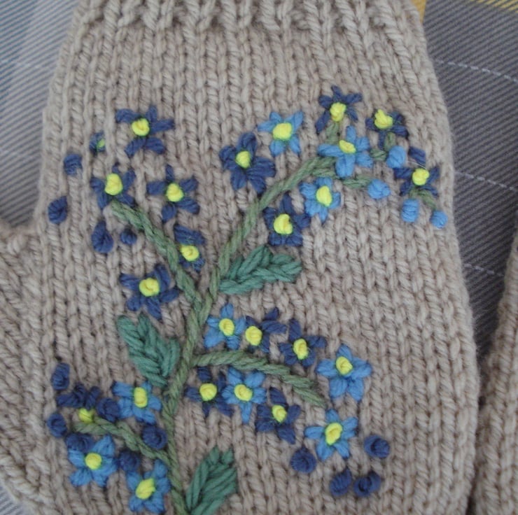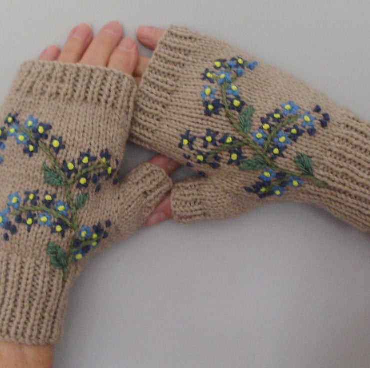 This is a lovely pair of thick Aran fingerless gloves. Embroidered with Forget-Me-Knots. Would fit small to medium hand, length 18cm. A great gift to a friend for Xmas or birthday. Please note the gloves are a terra cotta colour as seen on the hands in the first picture.