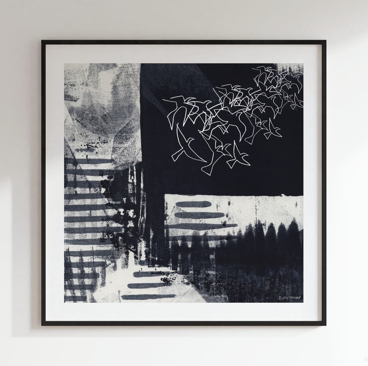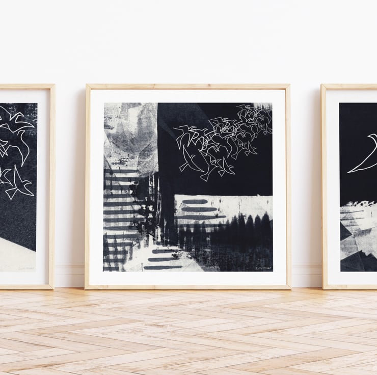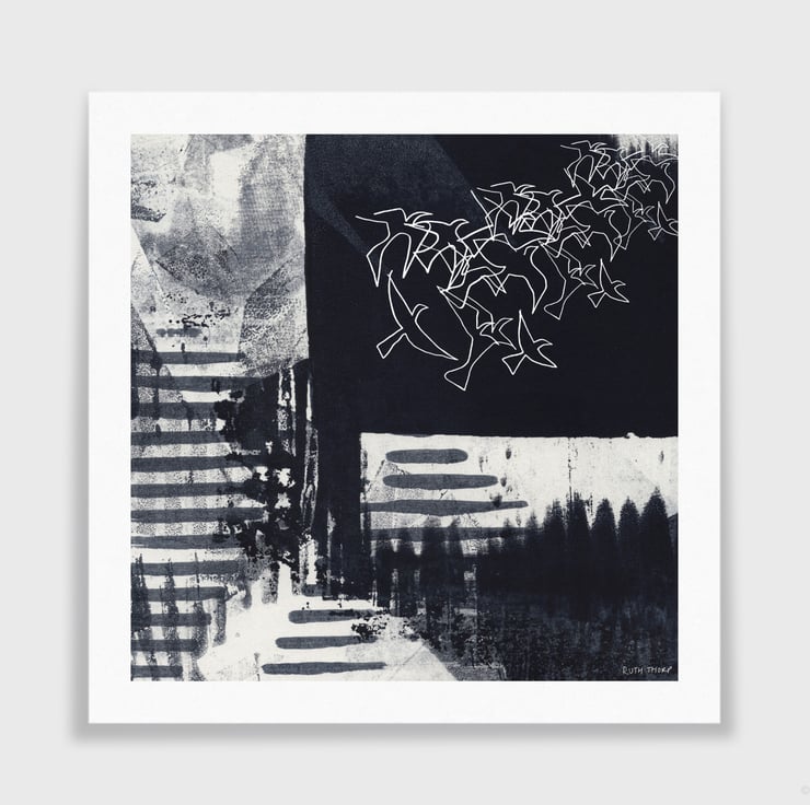 An abstract print of birds soaring over a city skyline. With bold contrasts and beautiful textures this design pairs well with the other bird prints in my Abstract Moments Collection.