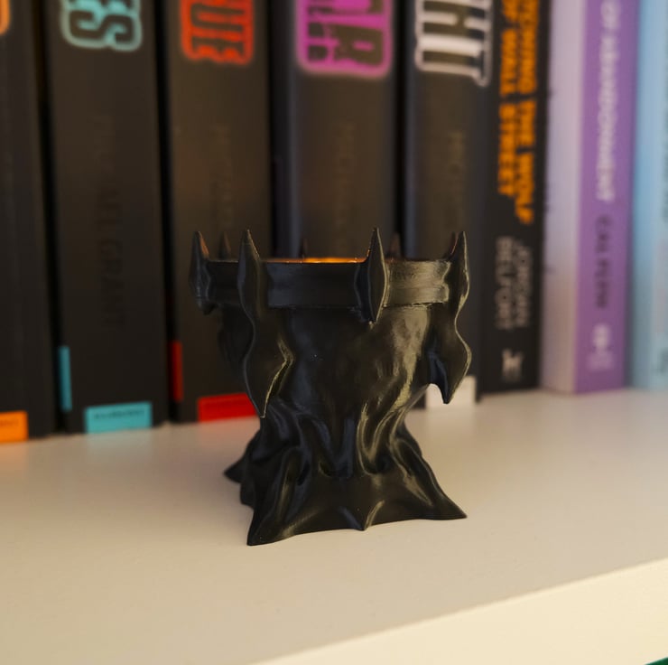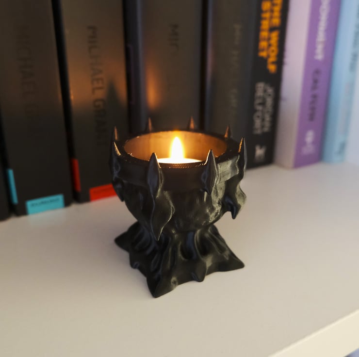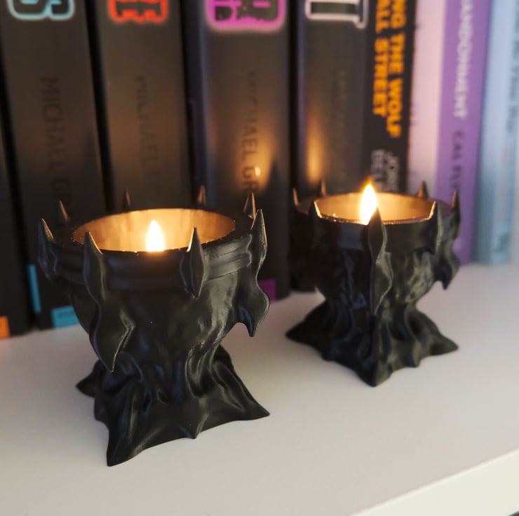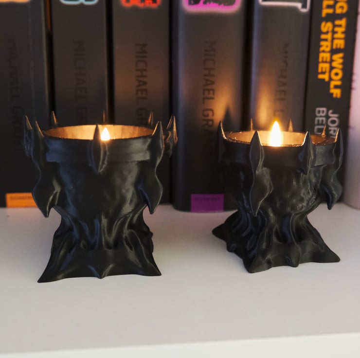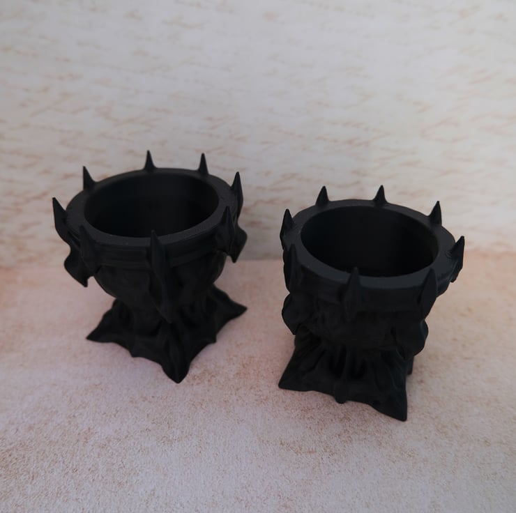 Transform your space with these gothic/fantasy inspired tea light candle holders. Available in two slightly differing designs. Both feature a bold and edgy design with angular spikes. Design one is slightly bigger (Height approx. 6.5cm,Width approx. 6.7cm) and design two is slightly smaller with more pronounced spikes and deeper engravings (Height approx. 6cm, Width approx. 5.8cm).
