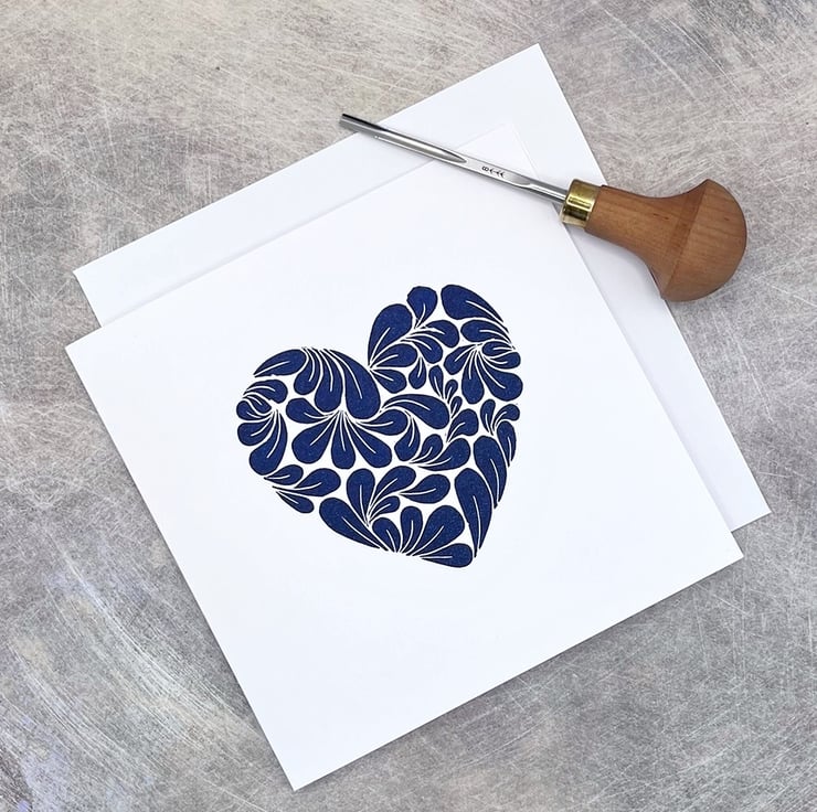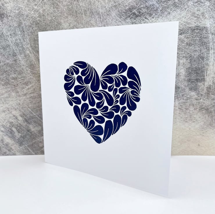 Original lino print of a Heart inspired by Cornish Mussel Shells, hand printed on a white greetings card using Prussian Blue, oil based, non toxic ink.