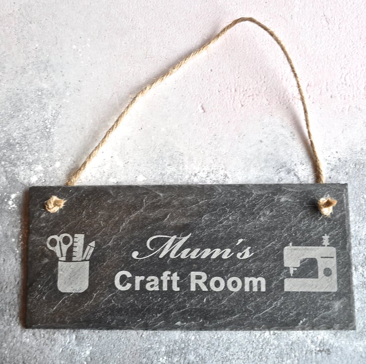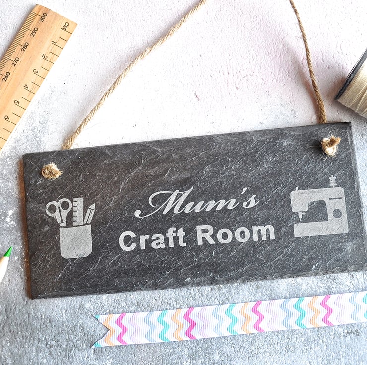 This craft room slate sign is the perfect gift to celebrate Mothers Day, Birthdays or Christmas. The sign can be personalised with a name of your choice whether it be Mum, Nanny or Jane. You may also have craft, sewing or art room if you wish. The sign is complete with it's very own pen pot and sewing machine engraved illustration.