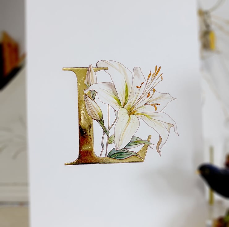 Original watercolour painting of a single white oriental lily flower entwined around a 2 carat gold leaf letter L.