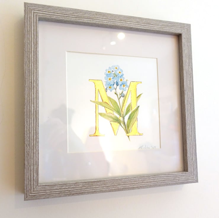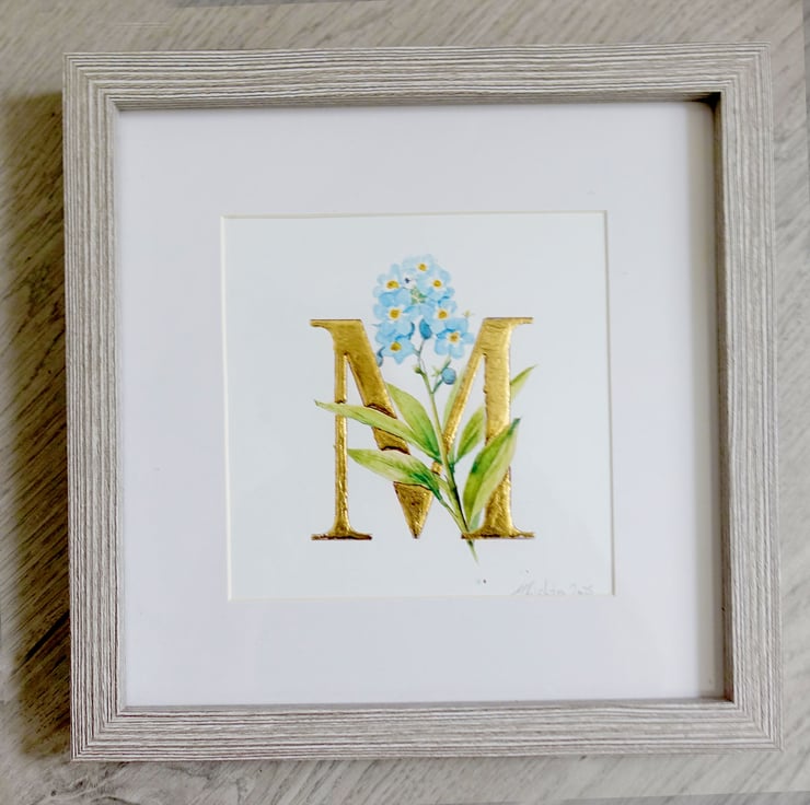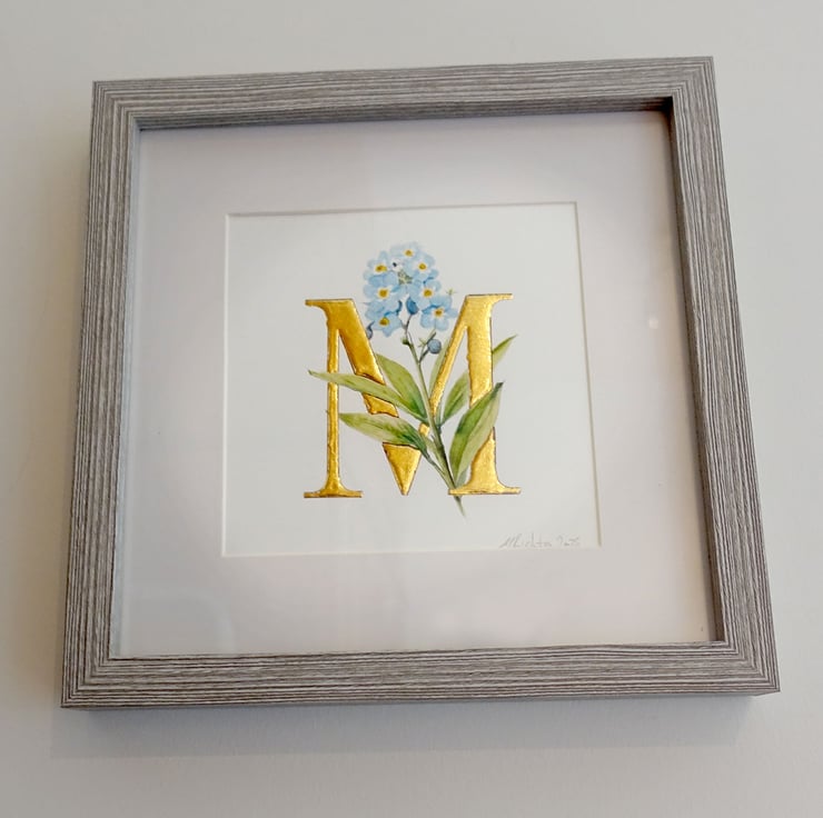 Original watercolour forgetmenots entwined around a letter M wrought in pure 24 carat gold leaf.