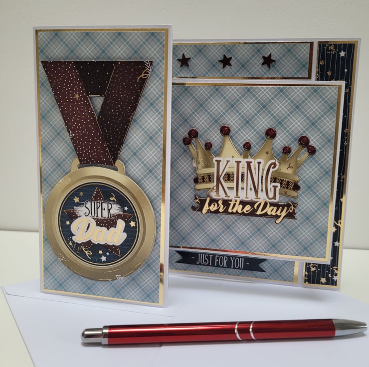 Shades of burgundy and blue together with gold accents come together in this special keepsake card. Featuring two sentiments on the front reading 'Super Dad' and 'King for the Day', and finished off with 'thanks for all you do' and 'Happy Father's Day' on the reverse side where you can add your greeting.