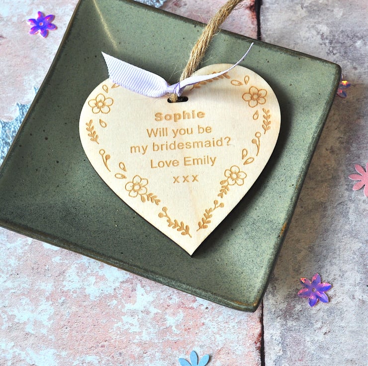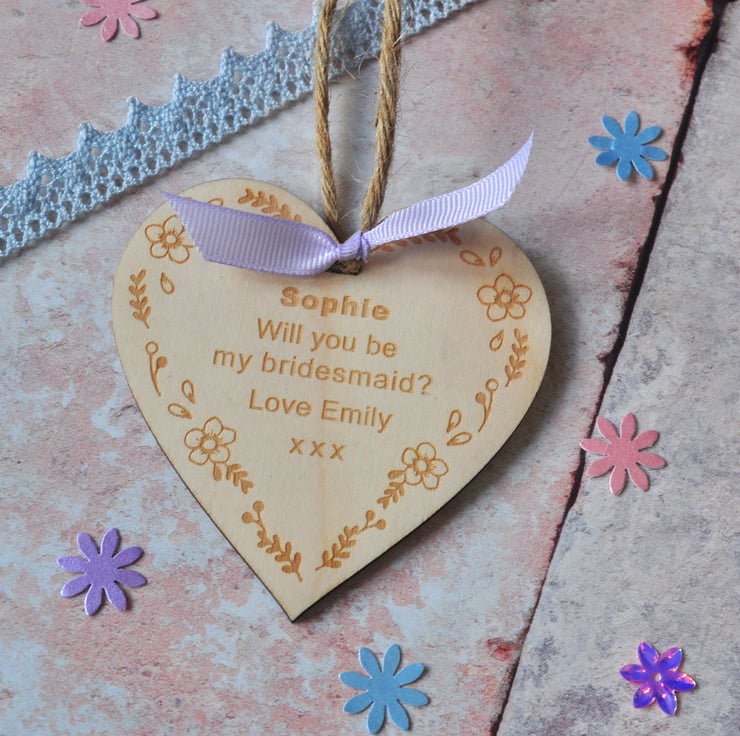 This personalised laser cut wooden heart decoration is the perfect way to ask your friend to be your Bridesmaid or Maid of Honour.
