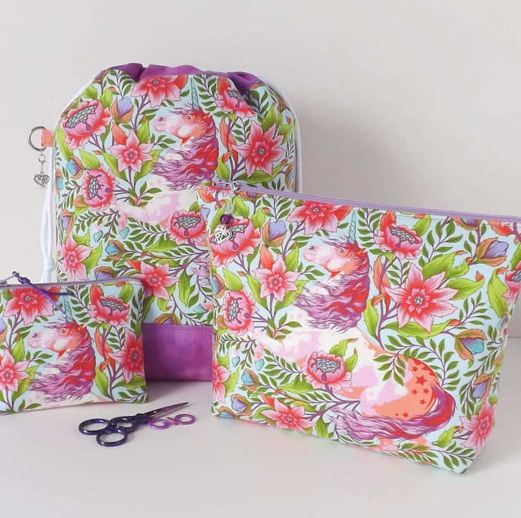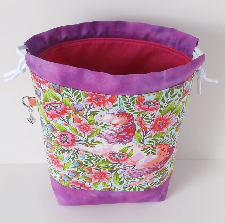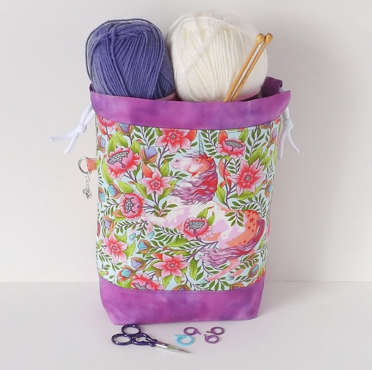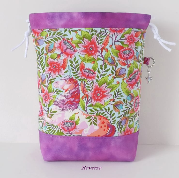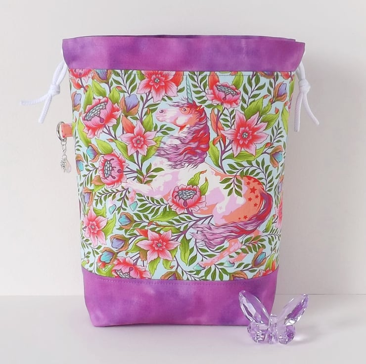 A project bag, drawstring bag, made from a lovely cotton fabric by Tula Pink, with a unicorn and floral design in shades of pink, purple and green on a pale blue background, combined with a pink/purple tonal fabric. The lining is plain pink cotton.