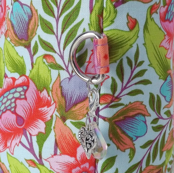 I have included a charm/stitch holder which is attached to a D ring on one side of the bag, and the bag closes with matching drawstrings.
