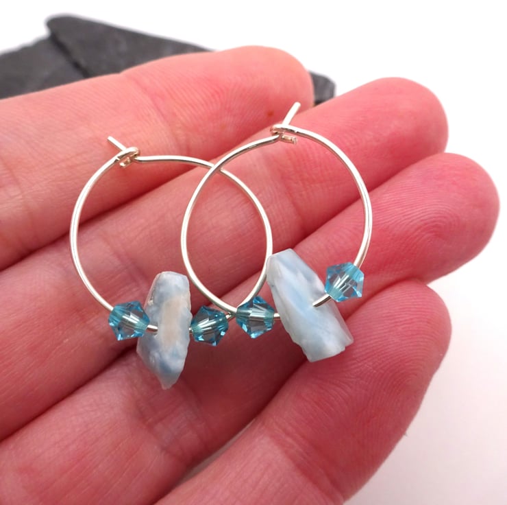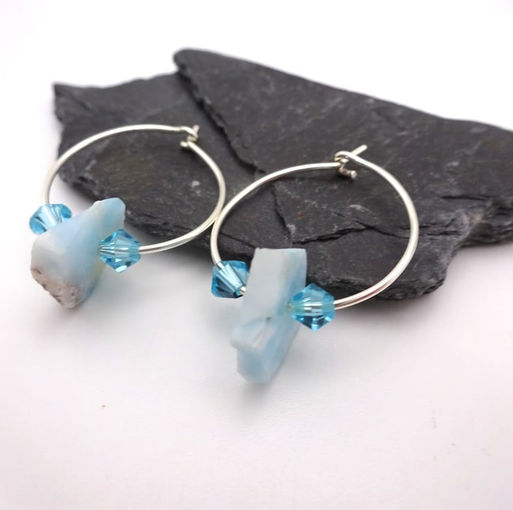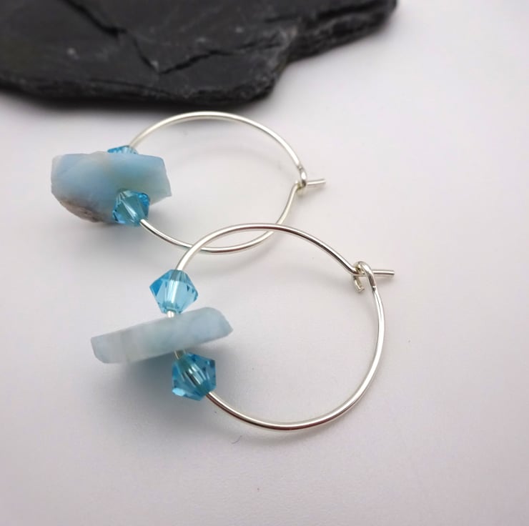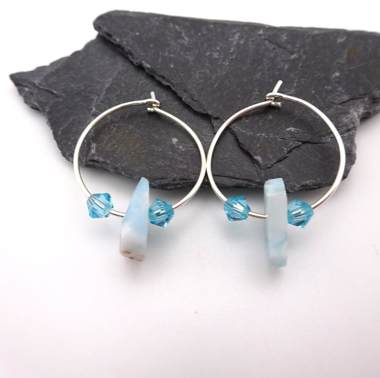 A pair of sterling silver hoop earrings featuring blue crystals and Larimar gemstone beads.