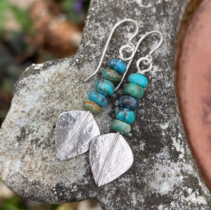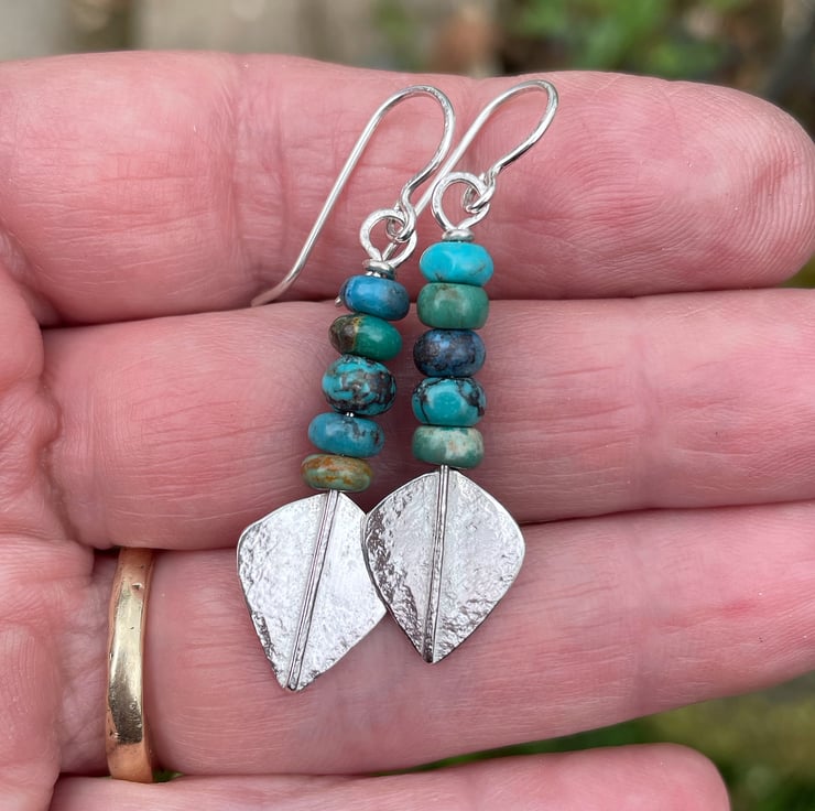 The silver has been given a bright burnished finish. I have added a stack of turquoise beads in shades of blue and green.
