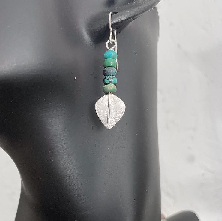 Small lightweight sterling silver spear earrings with a mix of blue green turquoise beads.
