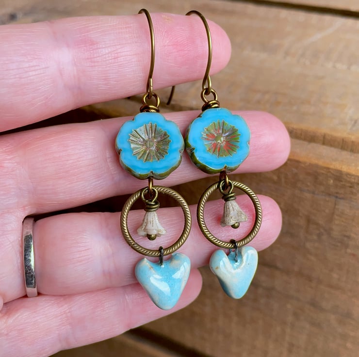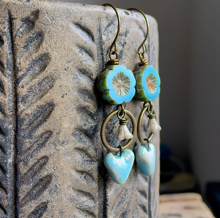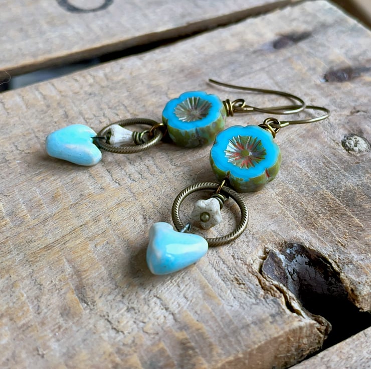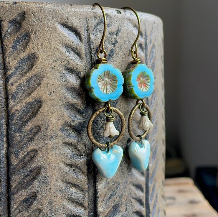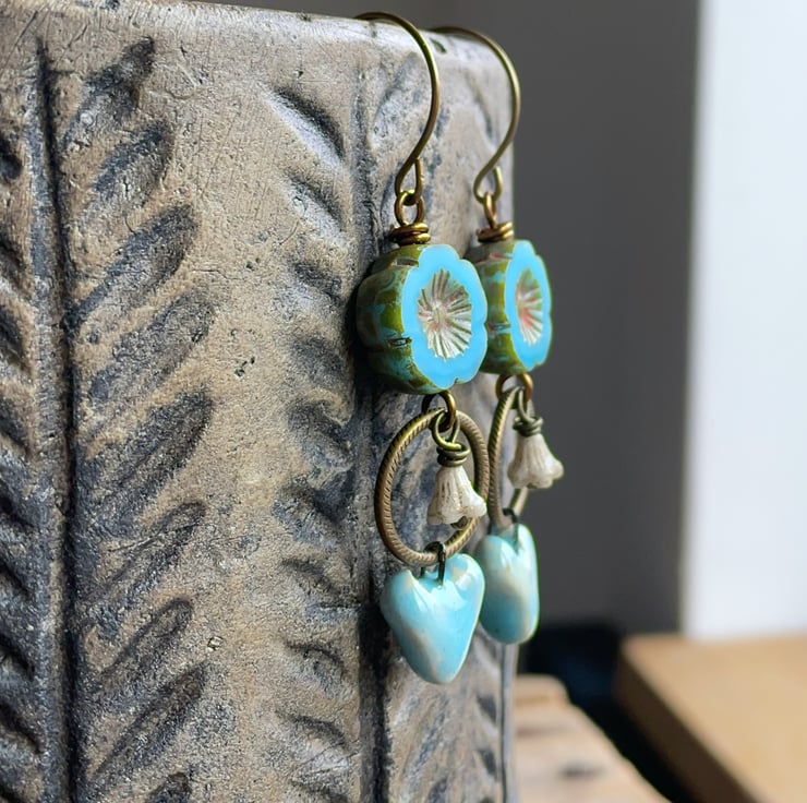 They feature sky-blue Czech glass flowers, with a rustic Picasso finish around the edges and in their carved centres. Beneath, ivory coloured bell flowers are suspended inside textured brass rings, adding delicate movement to the design.