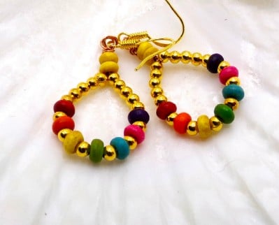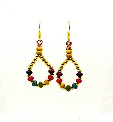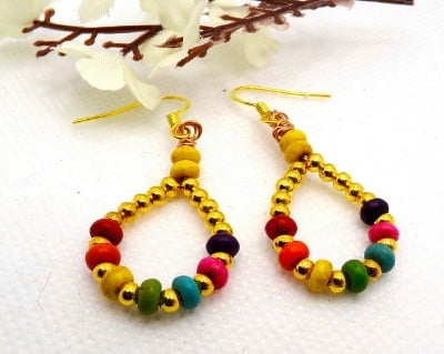Colourful earrings featuring 4mm dyed rondelles in the colours of the rainbow, accentuated with small gold plated spacer beads. The earrings have gold plated shepherd hooks.