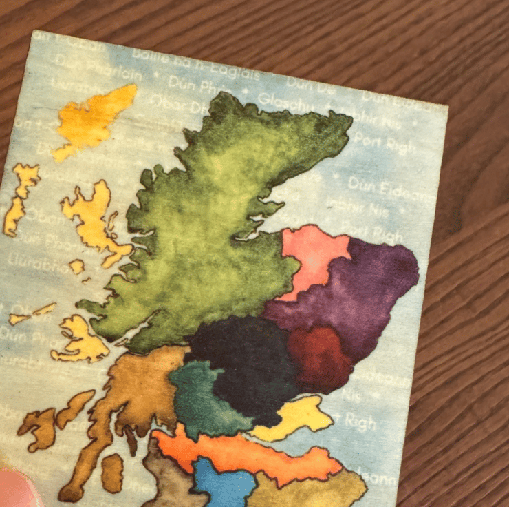 A wooden magnet which has a watercolour image of Scotland which has been edited to have a background made from the main cities and towns of Scotland and the Islands in their Gaelic form.