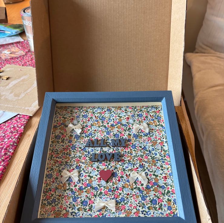 The Charlie ‘All My Love’ Box Frame is a joyful expression of affection, handcrafted to warm hearts and brighten walls. With a vibrant Liberty-style floral background, hand-painted navy lettering, a bold red heart, and six delicate ivory bows, every detail is considered and cherished. Framed in our signature deep navy, this generously sized piece makes a beautiful gift for anniversaries, weddings, or just because. Handmade in our family-run studio, it’s a statement of love with a whimsical twist—timeless, playful, and ready to be treasured.